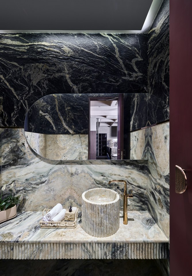 In the powder room, the palette shifts to lighter, swirling marble textures paired with a ribbed, hand-carved vanity and organic forms. An asymmetrical mirror slices through the space, offering both reflection and architectural drama, illuminated by a delicate cove lighting detail.