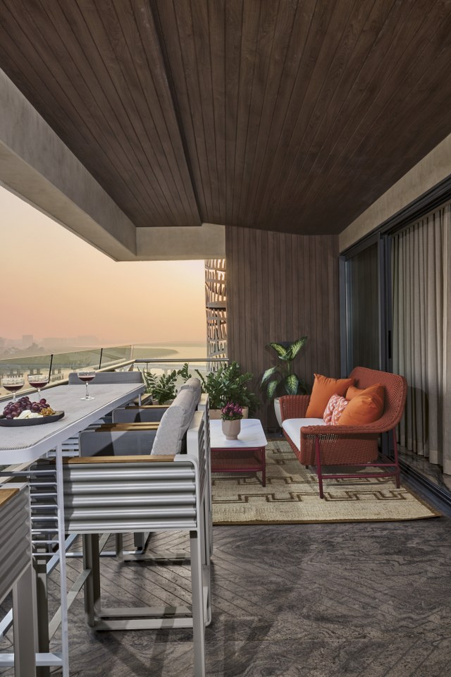 A thoughtfully designed deck endows tranquility as it faces the river and lets the inhabitants bask in the picturesque view. Chevron patterned marble flooring combined with veneer wall paneling enhance the coziness of the space. Pops of orange in the seating provide a vibrant contrast, and high seating facing the river offers a stunning view, creating a perfect space for relaxation and contemplation.