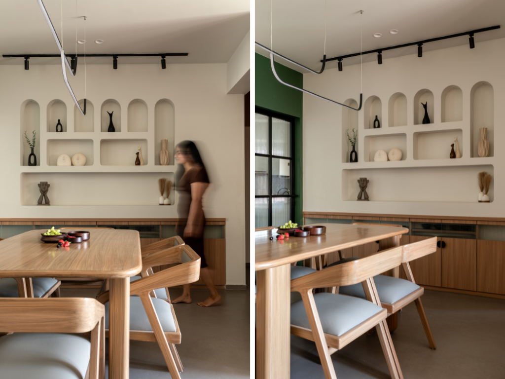 “Artful niches filled with complementary minimalist decor items complete this set-up, while a semi-blurred glass door reveals the kitchen, where the designer has placed storage below the counter to maintain a clean, uncluttered look.”