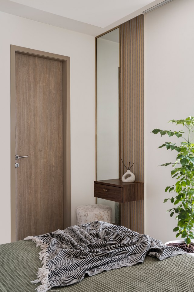 Embracing a bohemian vibe, the master bedroom is drenched in vibrant layers of raw and rustic materials of earthy houses. Rich walnut tones create an inviting ambiance, while rattan and woven details introduce tactile dimensions, reinforcing the organic aesthetic. This bedroom encapsulates mindful living, a retreat fostering relaxation while embracing modern aesthetics.