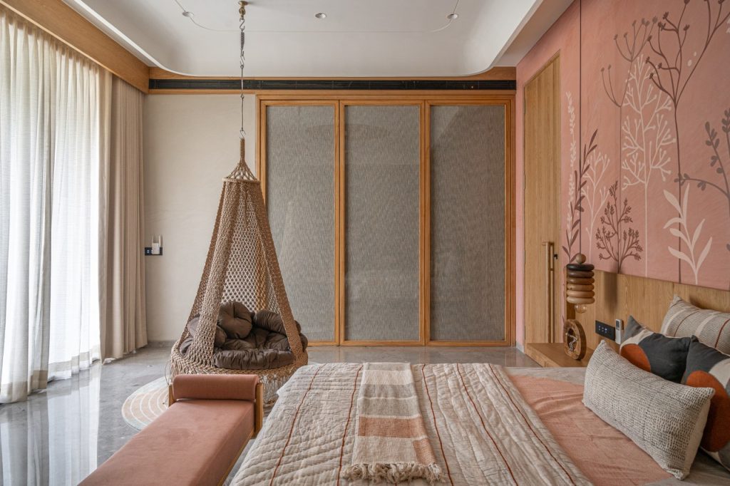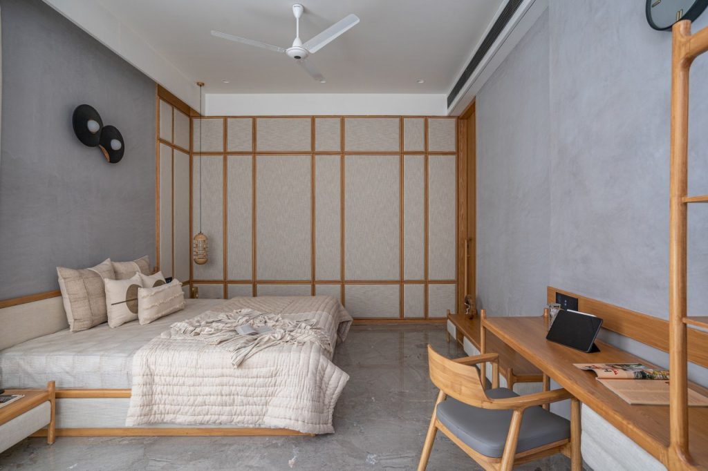The bedroom designs evolved to cater to both adults and children. The master bedroom features a minimalist wooden bed with layered textiles in neutral tones. Further, complemented by a desk for a work and a cozy armchair.
