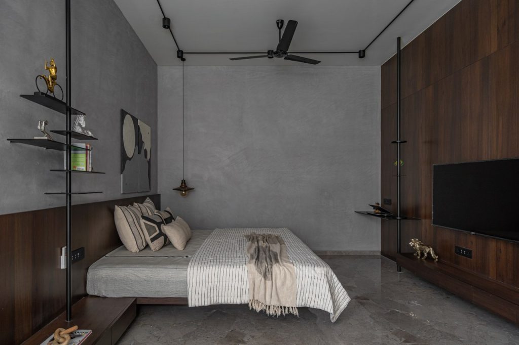 Unique pendent lights with wooden accents add a sculptural element, while large windows ensure a bright, airy feel. The master bedroom emerges as a tranquil retreat, with its minimalist design and layered armchair invites reading or relaxation.