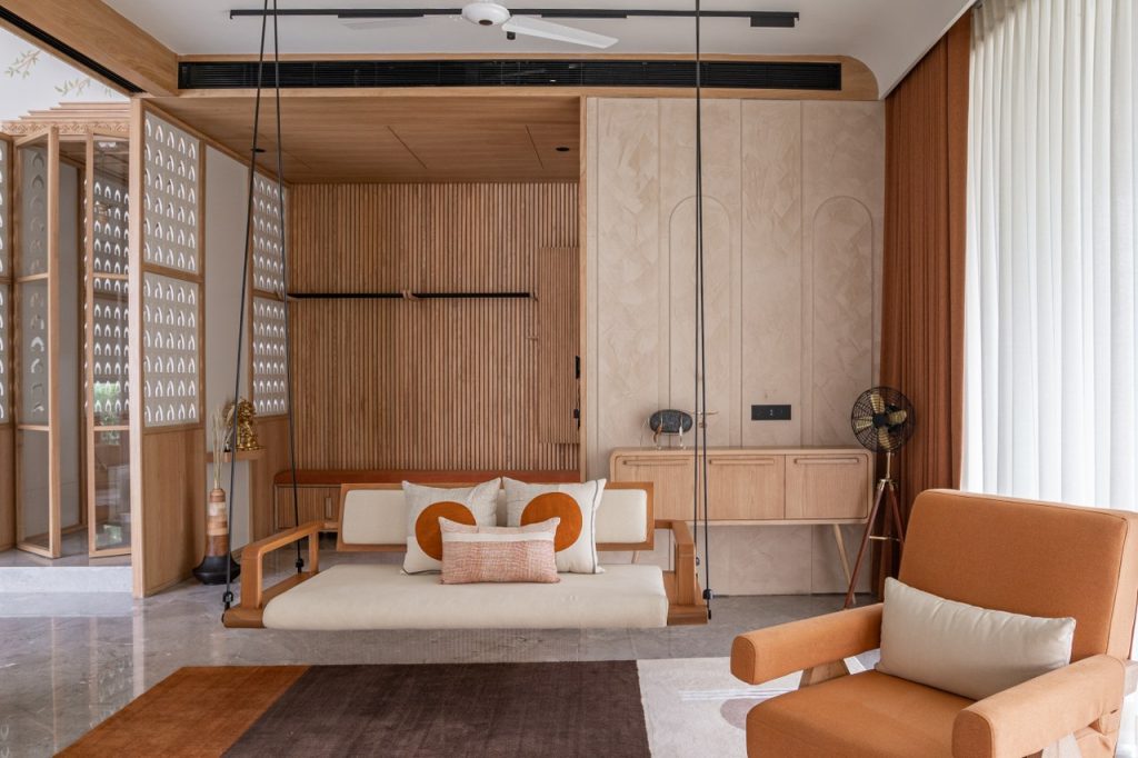 The Scandinavian-inspired design, infused with bohemian warmth, forms the backbone of the aesthetic. This approach balances minimalism with textured layers, ensuring the space feels both uncluttered and lived-in. The location in Ahmedabad, known for its rich cultural heritage and evolving modern landscape, influenced the use of locally sourced materials and craftsmanship, aligning with the studio’s sustainable ethos. The result is a home that reflects family’s values- comfort, togetherness, and an appreciation for nature – while staying rooted in the local context.