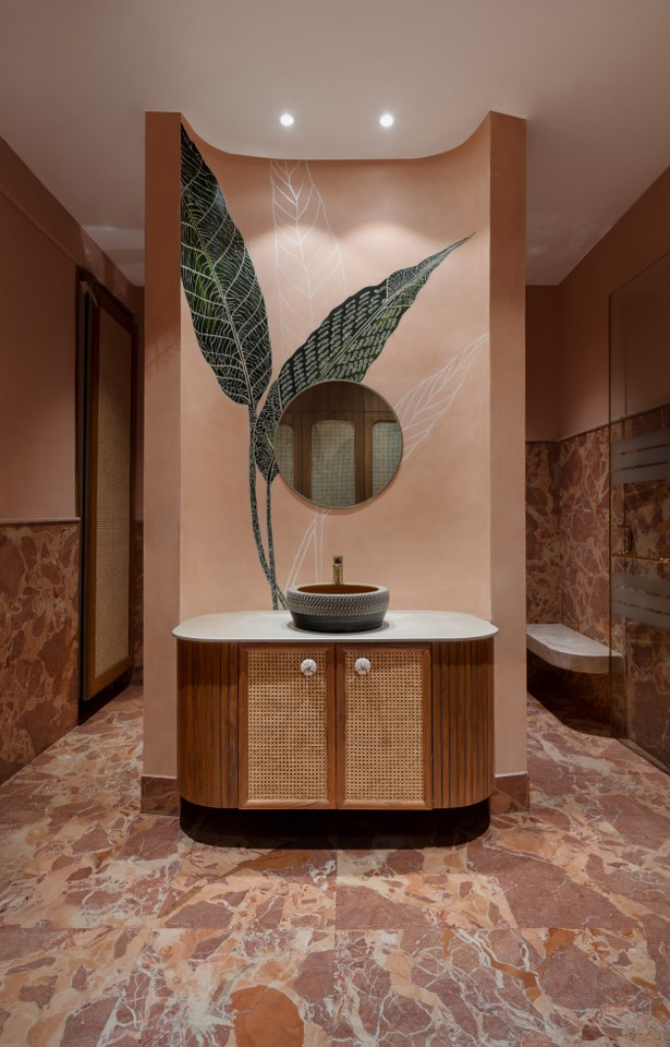 While the master bedroom and guest spaces celebrate understated luxury through a palette of natural stones, handcrafted tiles, and custom hand-painted artworks, the next generation resonates with a more global sensibility.