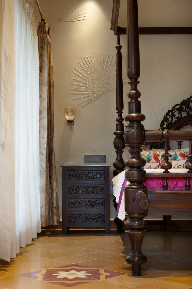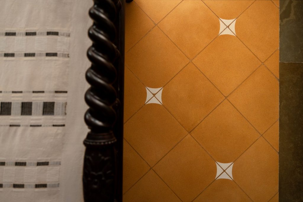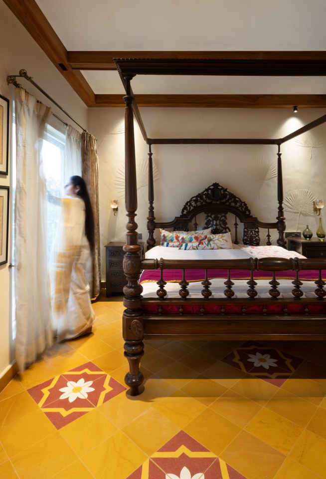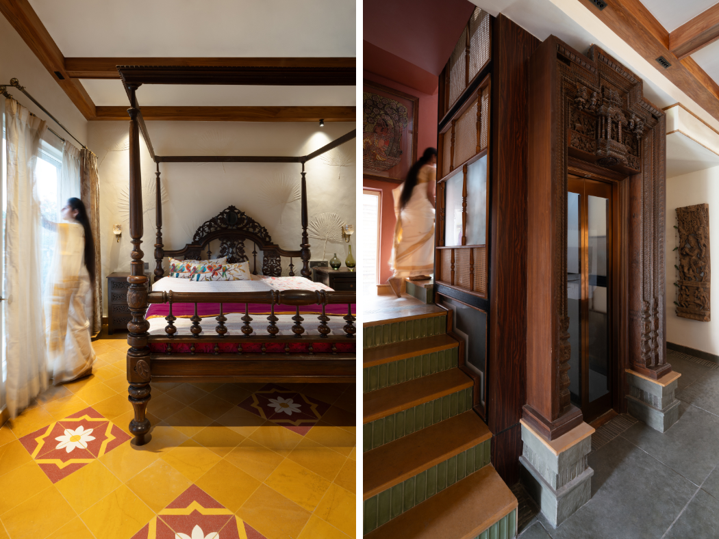 The flooring throughout this ancestral house is inspired by the intricate cultural patterns from Kerala and Tamil Nadu. The detailing found in their homes, as well as the patterns on their sarees—specifically their borders and motifs—carry cultural narratives, and this craftsmanship, in turn, inspired many textures throughout the house. Through meticulous skill, the local craftsmen translated the fluid beauty of fabric into the permanence of stone. Designers chose Green Kota as the base for brass and red stone inlays because of its subtle tones that evoke a sense of grounded calm. They used it to trace delicate lotus blooms and kolam patterns reminiscent of Kerala’s backwaters and temple courtyards. Moreover, materials like teak wood, terracotta, Jaisalmer stone, and lime plaster anchor the home in traditional tactile poise, yet they coexist effortlessly with brass fittings and modular kitchens.