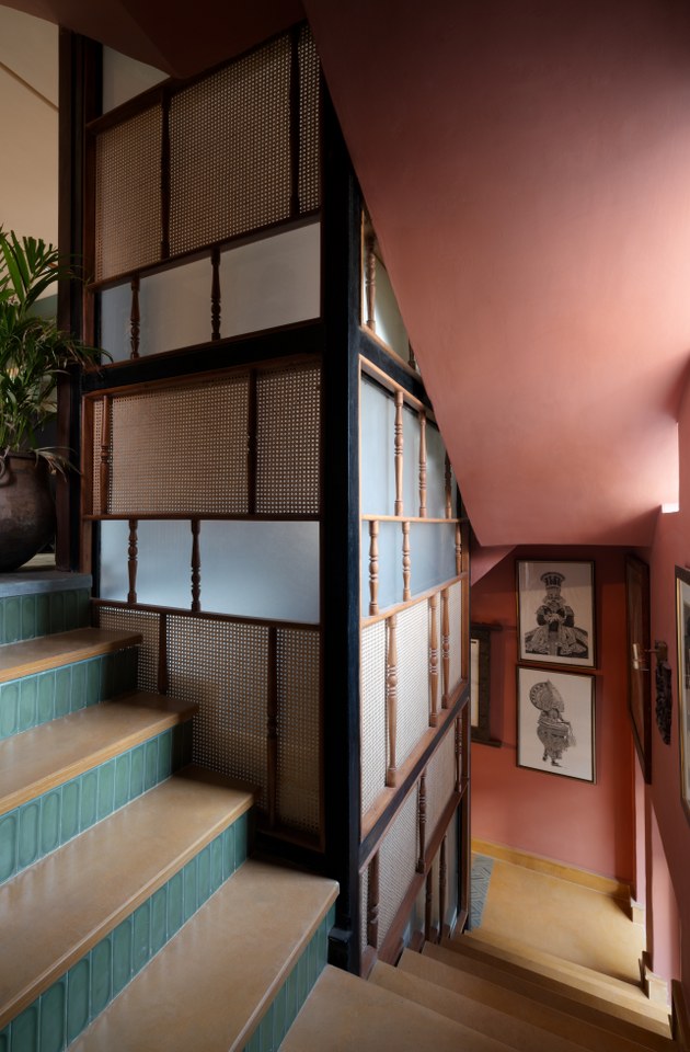 The material palette of this ancestral house balances natural tones with refined precision. “Builders use lime plaster—a breathable, antimicrobial, and timeless material—extensively on the walls and ceilings.” “Choone ki taaseer thandi hoti hai” (lime is naturally cool), says designer Swati Goenka. The family chose lime for its energy efficiency, breathability, and toxin-free air quality. Lime-plastered walls, imprinted with leaves, add texture and symbolise nature and tradition, reflecting the client’s identity.