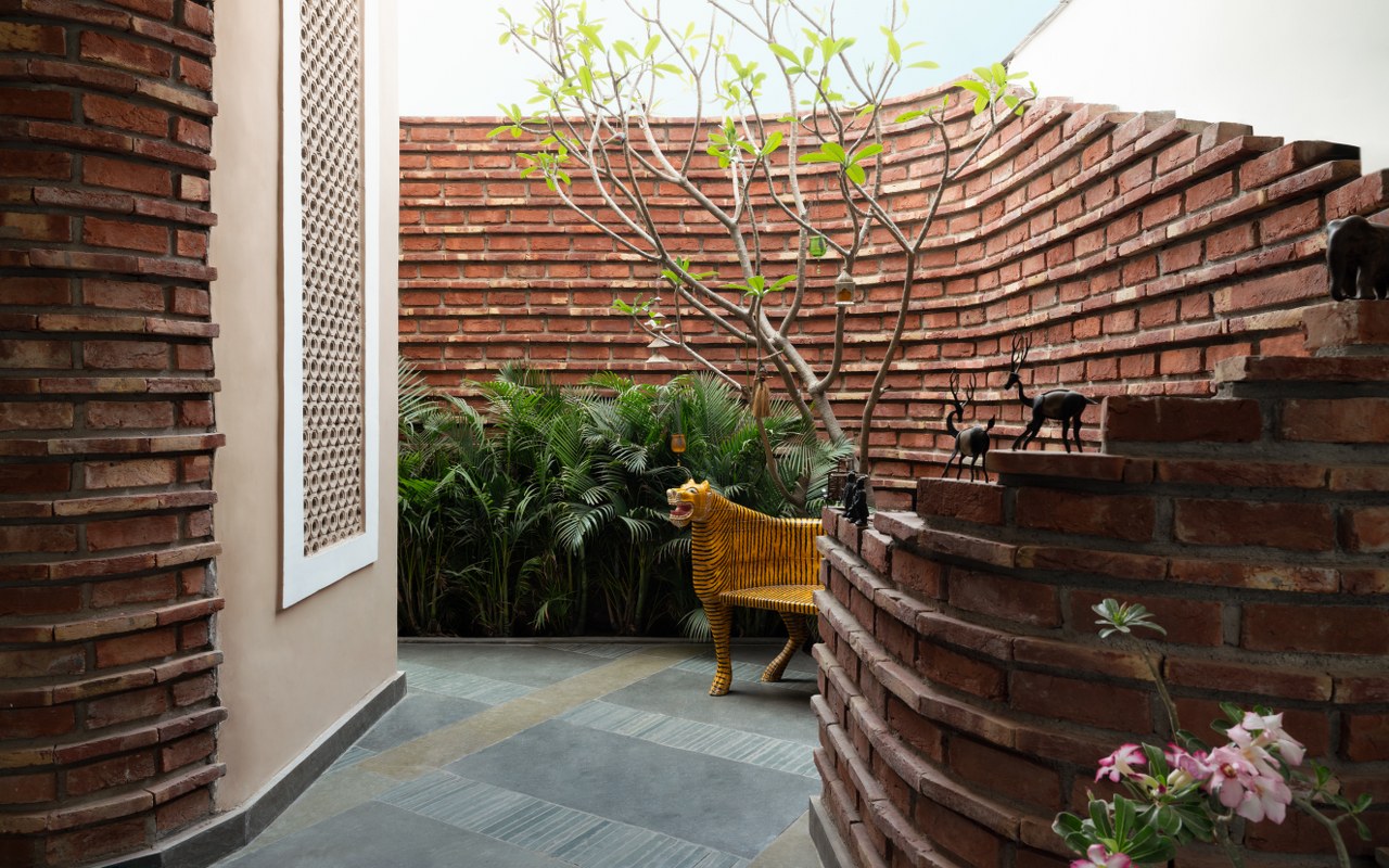 Exposed brick forms the accent of the backyard and terrace, adding both texture and rhythm to the spaces. Developed through computational modelling and refined by on-site experimentation, these walls were built by carefully laying vertical and horizontal bricks in an alternating pattern, hosting a gentle cadence of light and shadow through the day. Towards the center it accentuates as a parabolic arch to house the mandir, the house temple. At the end, the wall turns away and curves inwards to embrace the bar–a sculptural intervention that blurs the line between function and form.