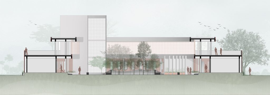 Materiality reinforces the project’s contextual grounding. The use of locally available red sandstone, brick, terracotta blocks, and perforated jali screens lends the building a distinct regional identity while enhancing thermal performance and passive cooling. Semi-open verandas, shaded corridors, and filtered daylight reduce heat gain and promote natural ventilation throughout the year.
