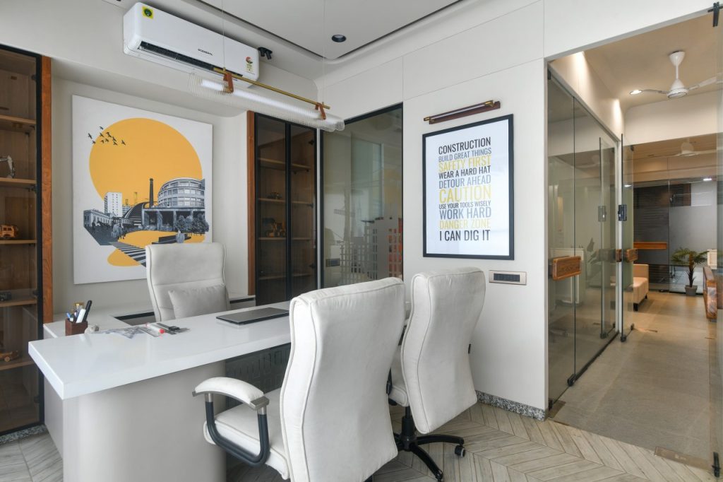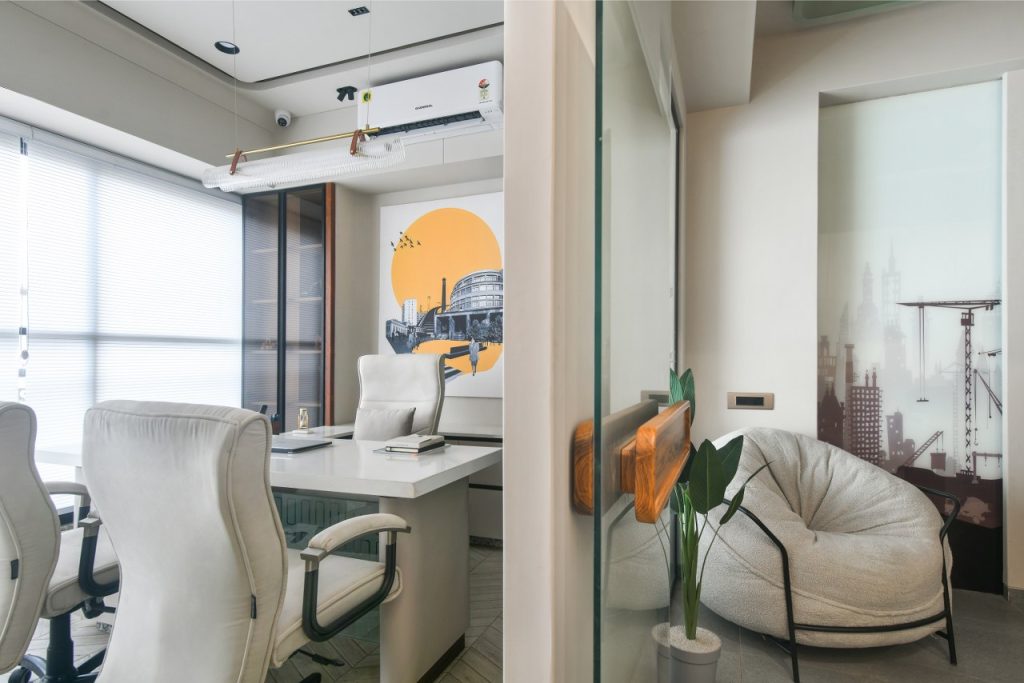 The design of the engineer office embraces a raw and intentional language. It uses mild steel (MS) in custom-built furniture to lead its aesthetic. The team crafted everything—from the reception desk to the workstations. MS serves as more than just a material; it stands as a metaphor for structure, strength, and foundational work. Clean lines and muted finishes ground the space while subtly celebrating the precision that defines the profession.
