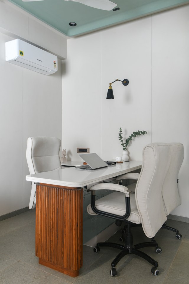 Every project comes with its own set of challenges, and for this civil engineer office, the most significant one was spatial planning. With just about 580 sq. ft. to work with, accommodating a reception, pantry, toilet, staff area, director’s cabin, and son’s cabin demanded meticulous zoning and creative space optimisation. Through thoughtful planning, we ensured that every square inch served a purpose for instance, the pantry door was seamlessly integrated into the engraved feature wall, maintaining visual continuity while concealing functionality.