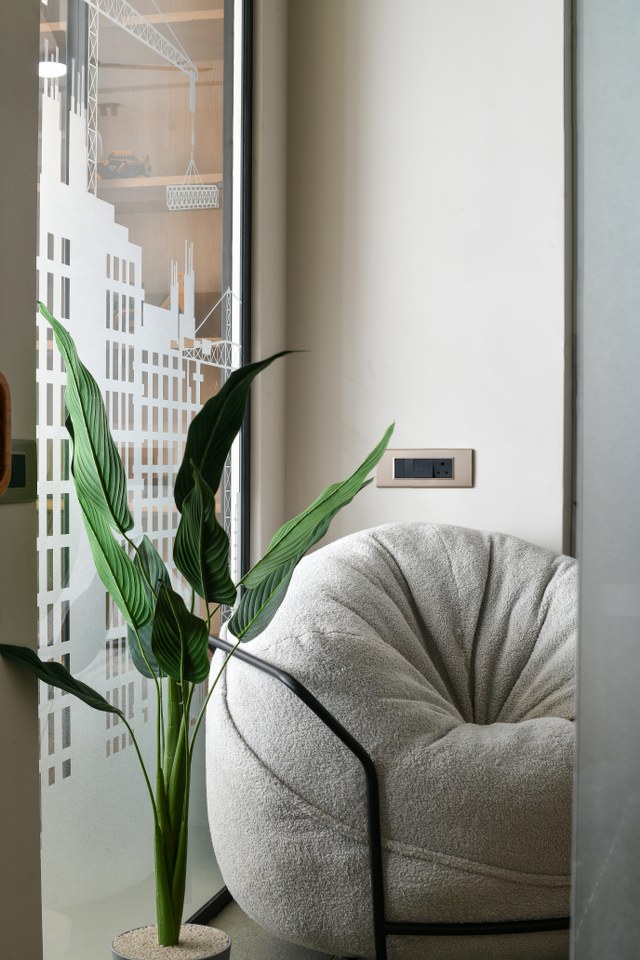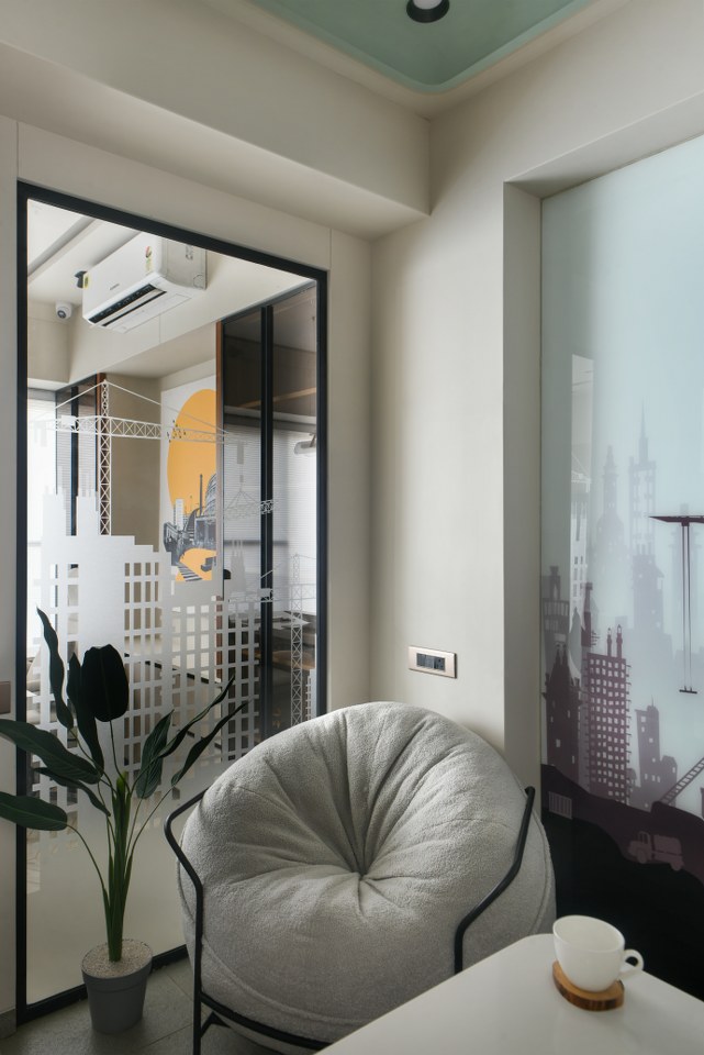 What sets this studio apart is its storytelling through elements that are often left behind on construction sites. A civil engineer’s office equipment, machines and maps are lovingly preserved and framed. They sit alongside original sketches and site plans, reimagined as part of the artwork. These aren’t mere props—they are lived experiences turned into design moments.