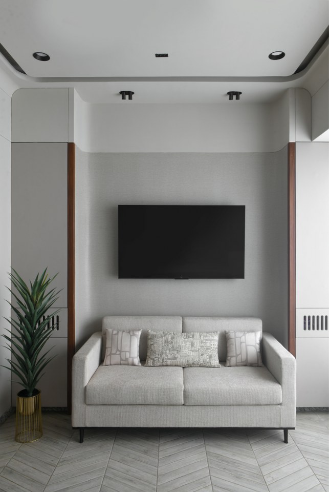 Another major challenge was the ceiling height. The site had deep beams running across, and we didn’t want to lose the sense of openness by boxing them in. Instead, we tactically designed the ceiling layout to retain a generous 10.5 ft height, giving the space an airy, expansive feel despite its compact footprint.