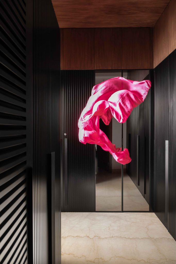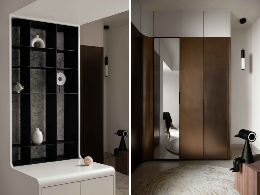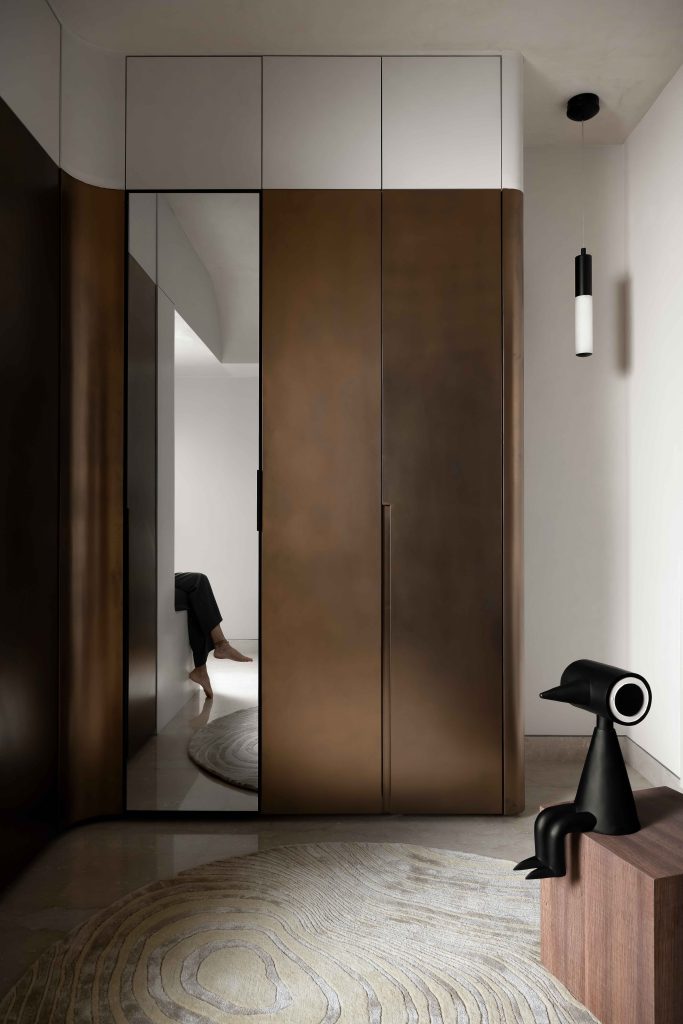 Despite the limitations prompted by the tight floor space, the integration of maximum storage was the biggest challenge. The design integrates this storage in many forms with its mixed use functions, like storage built-in seater, panelled off foyer and crockery unit integrated with the fridge. Having a specific requirement for some metallic element, the foyer is encountered with a beautifully crafted, toned down rose gold metallic palette. Across the house a hint of black flows in multiple details, as a common visual thread.