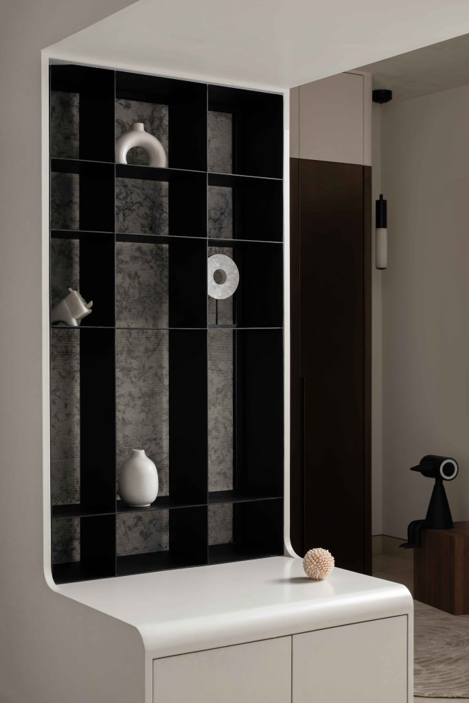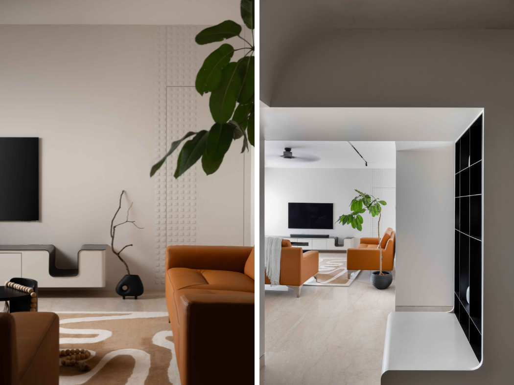 To create a wider entry, the design team broke a wall to allow a stronger visual connection from the foyer. They kept the pivot linking the foyer to the living space minimal, while an organically patterned rug adds a subtle theatrical quality to the setting. Connected white marble and teak dining added to the simplicity.The mood board is subtle and clutter-free, leaning onto earthy tones as a base, with each space having one pop highlight that allows for a subtle tint of visual balance.