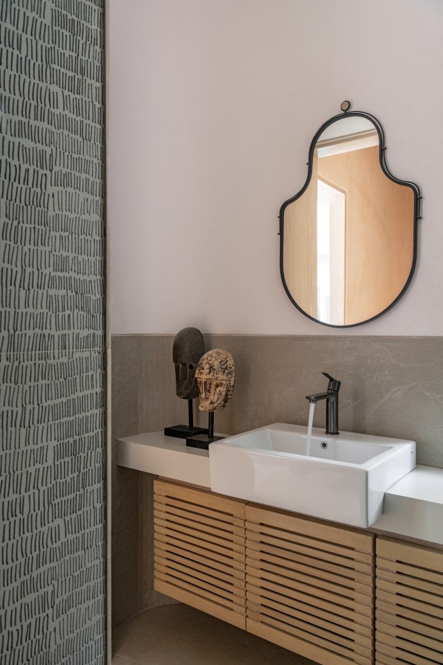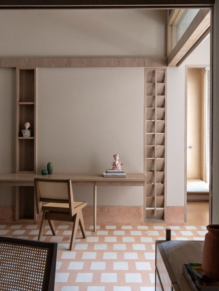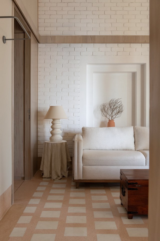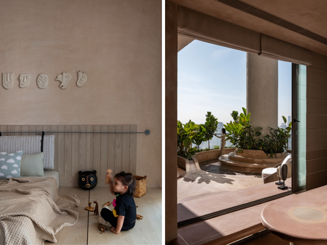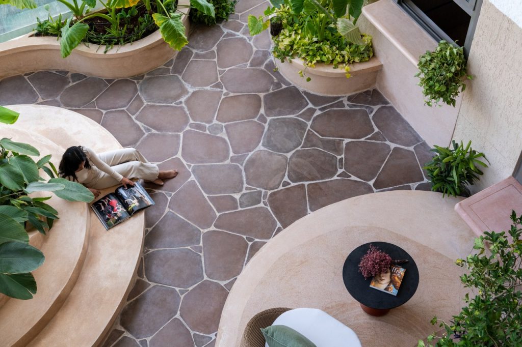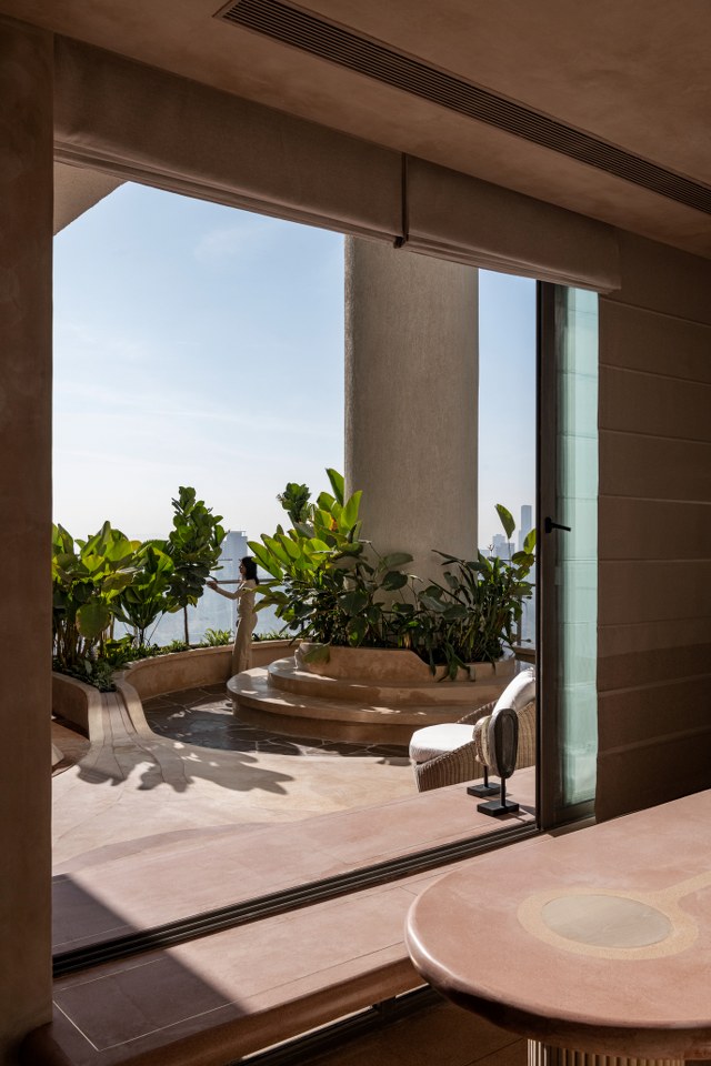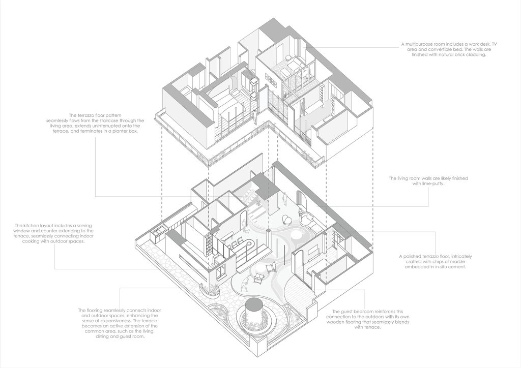 The flooring pattern, flowing seamlessly from inside to out, serves as a visual connector. It makes the floor plate appear more expansive and cohesive. Here, the terrace becomes an active extension of the common areas. Such as the living, dining, and guest bedroom, blurring the boundaries between inside and out.
