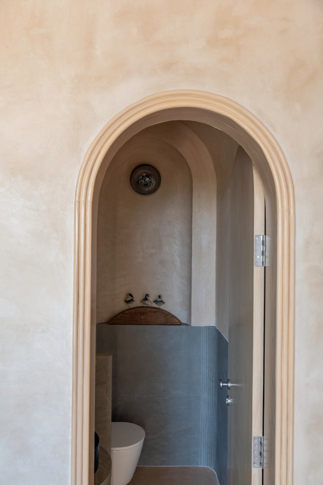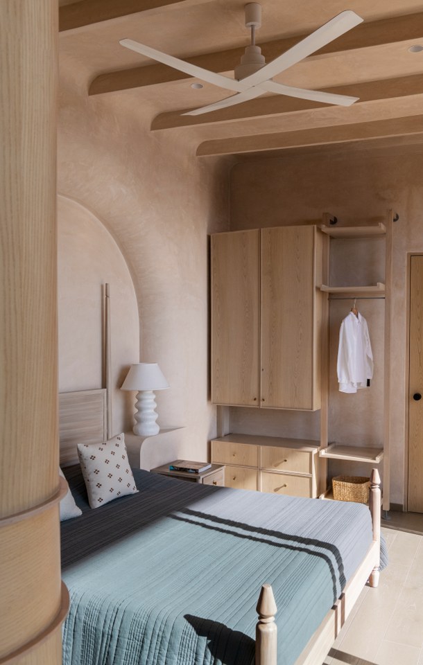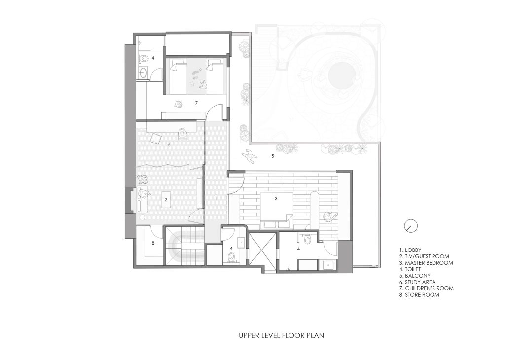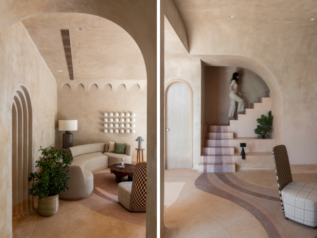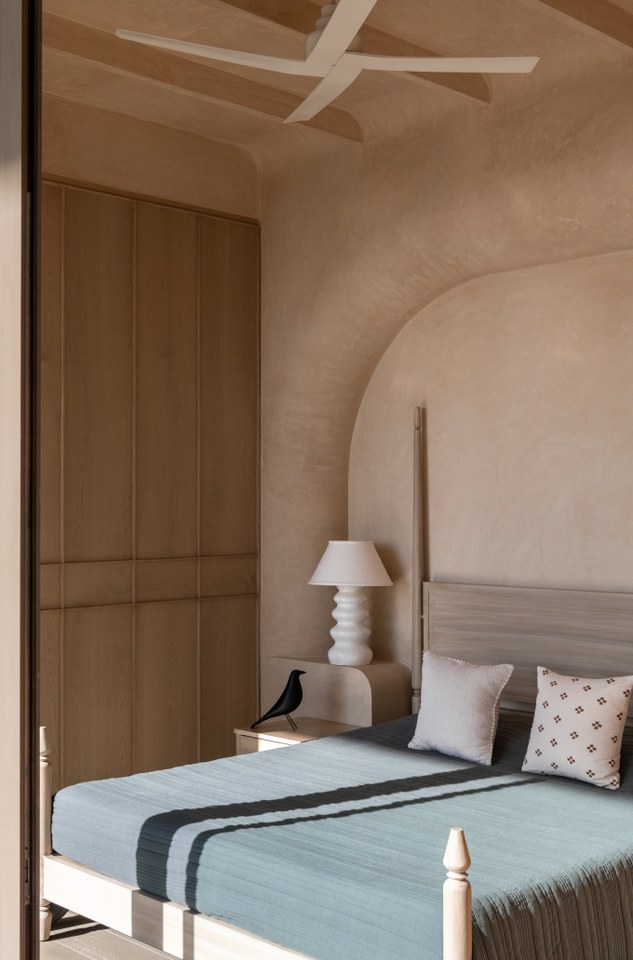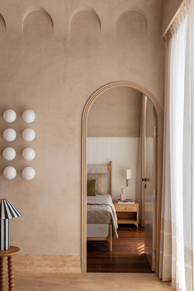 Indoors, a multipurpose room caters to various needs with a work desk, TV area, and part-time bed setup, while the master bedroom embodies fluidity and fashion sensibility, with a symmetric arched bed back wall inspired by Indian art.