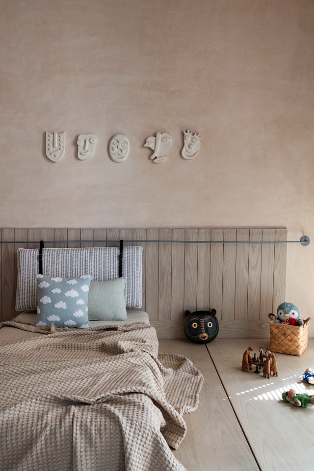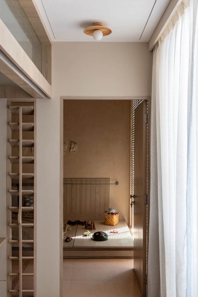 To add play to the kids’ bedroom, we incorporated a raised platform adjacent to the bed. The guest bedroom on the lower floor blends with the outdoor wooden flooring, further emphasising the indoor-outdoor relationship.