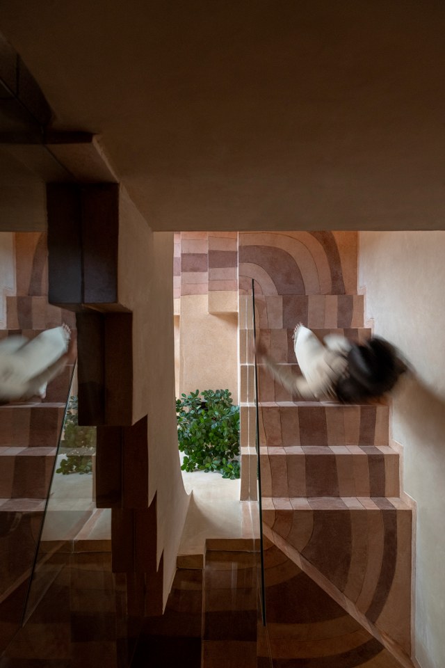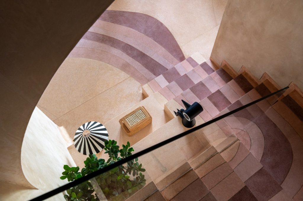 Following the owner’s decision about avoiding rugs on the floor, the design team ingeniously devised an in situ casted terrazzo floor pattern. It gracefully flows from the staircase to the living area. It extends uninterrupted onto the terrace, terminating in a planter box.