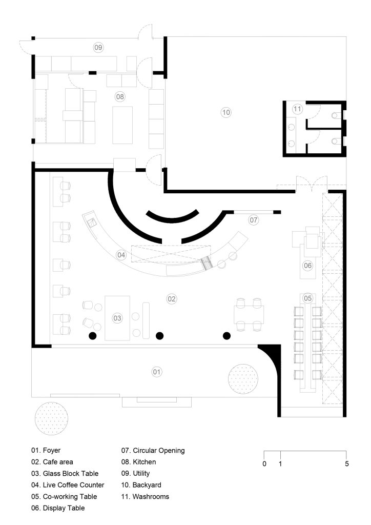 Rather than dividing the café into rigid zones, the designers create spatial segmentation by guiding occupants toward intuitive movement.