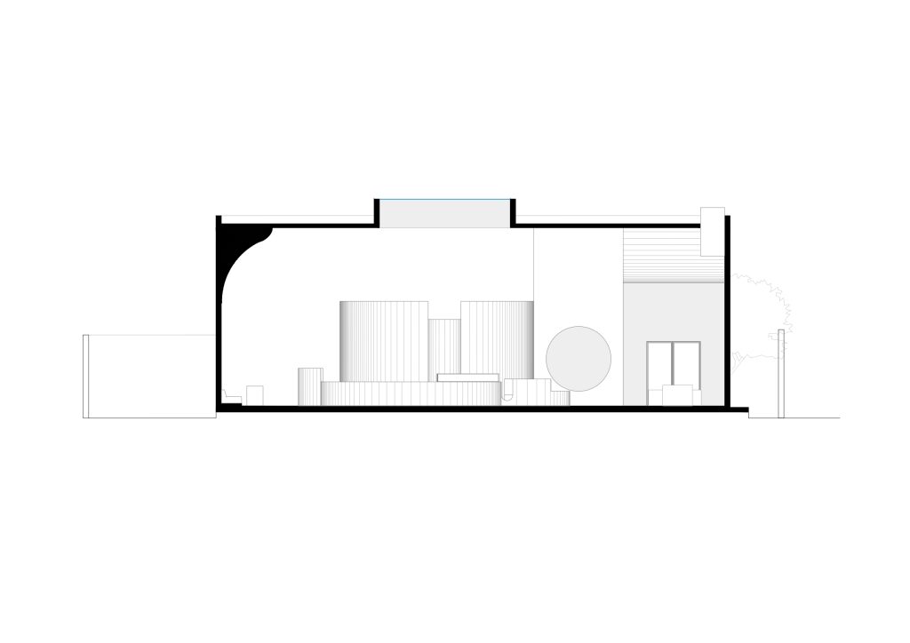 The exterior facade is wrapped as a rectangular vessel, existing solely for the purpose of a window into the interior space by way of the jumbo glass looking into the curved elements, ie : the counter and the curvilinear backdrop wall.