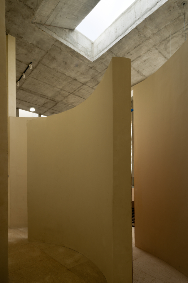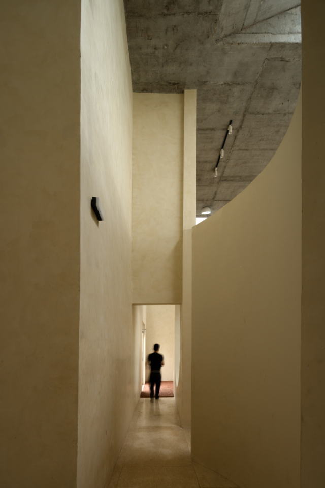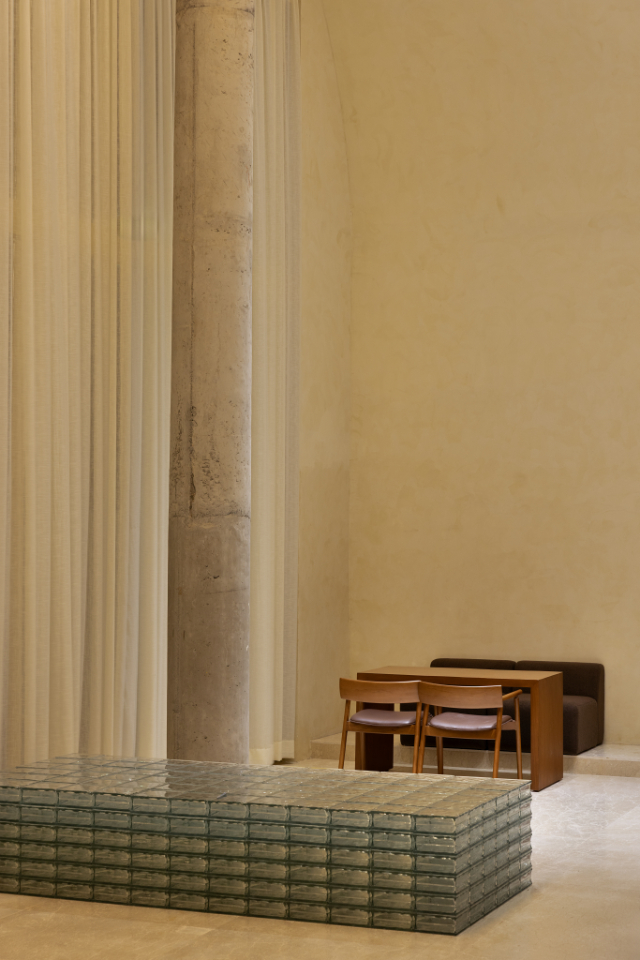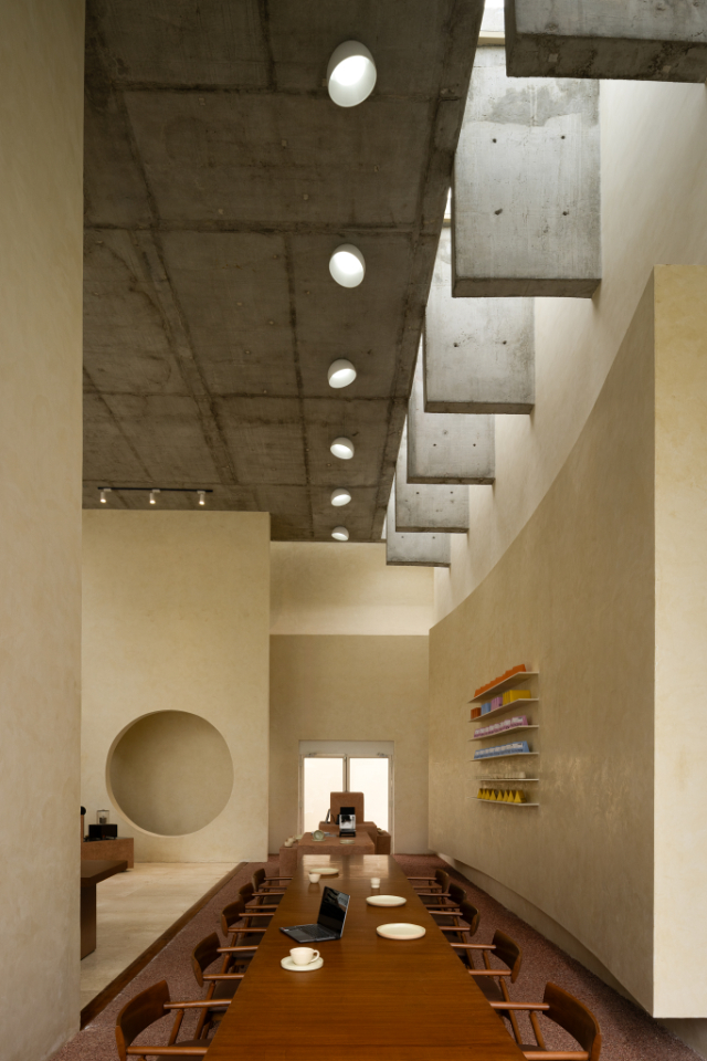 At the centre, a skylight captures the softer evening light, diffusing it gently as it reaches the counter below through the curved form. The designers cut a volumetric circle near the main counter to balance the geometry and frame the wait staff as they carry dishes.
