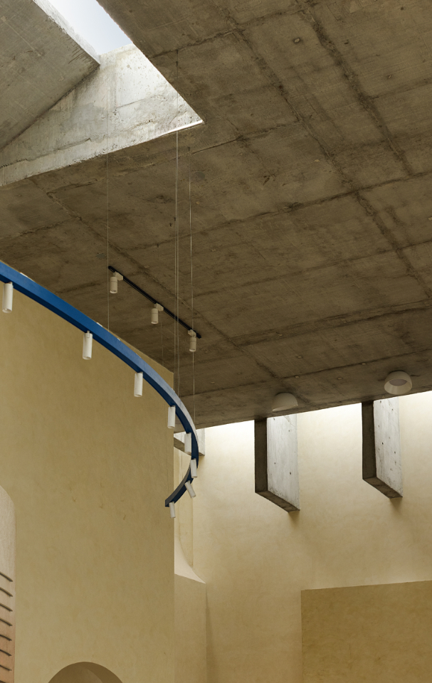 Light remains the most dominant element throughout the day. The site receives both east and west light. A series of equidistant, low-hanging beams animate the ceiling plane, allowing the space to come alive from sunrise to sunset. Beneath that lies a community table accommodating 16 pax planned to host community events, workshop or as a coworking space.