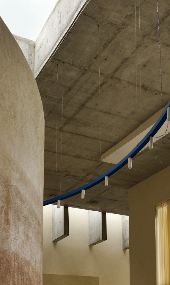 Material choices reinforce this narrative. The textured wall surfaces and muted colours derive from earthy tones that gradually transition into lighter, beach-like shades showing a sense of weathering. “We wanted the materials to feel evolved naturally over time inspired from the evening suns’ reflection of the same (colors) symbolising the name eventide.