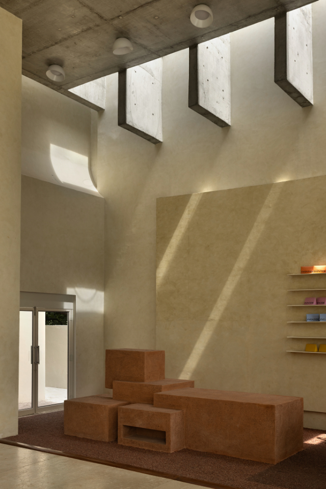 Inline to the community table, a dedicated merchandise area has textured stacked cuboidal shapes, designed to accommodate the products at varying viewing angles and heights to be noticed from any point of the cafe seating.