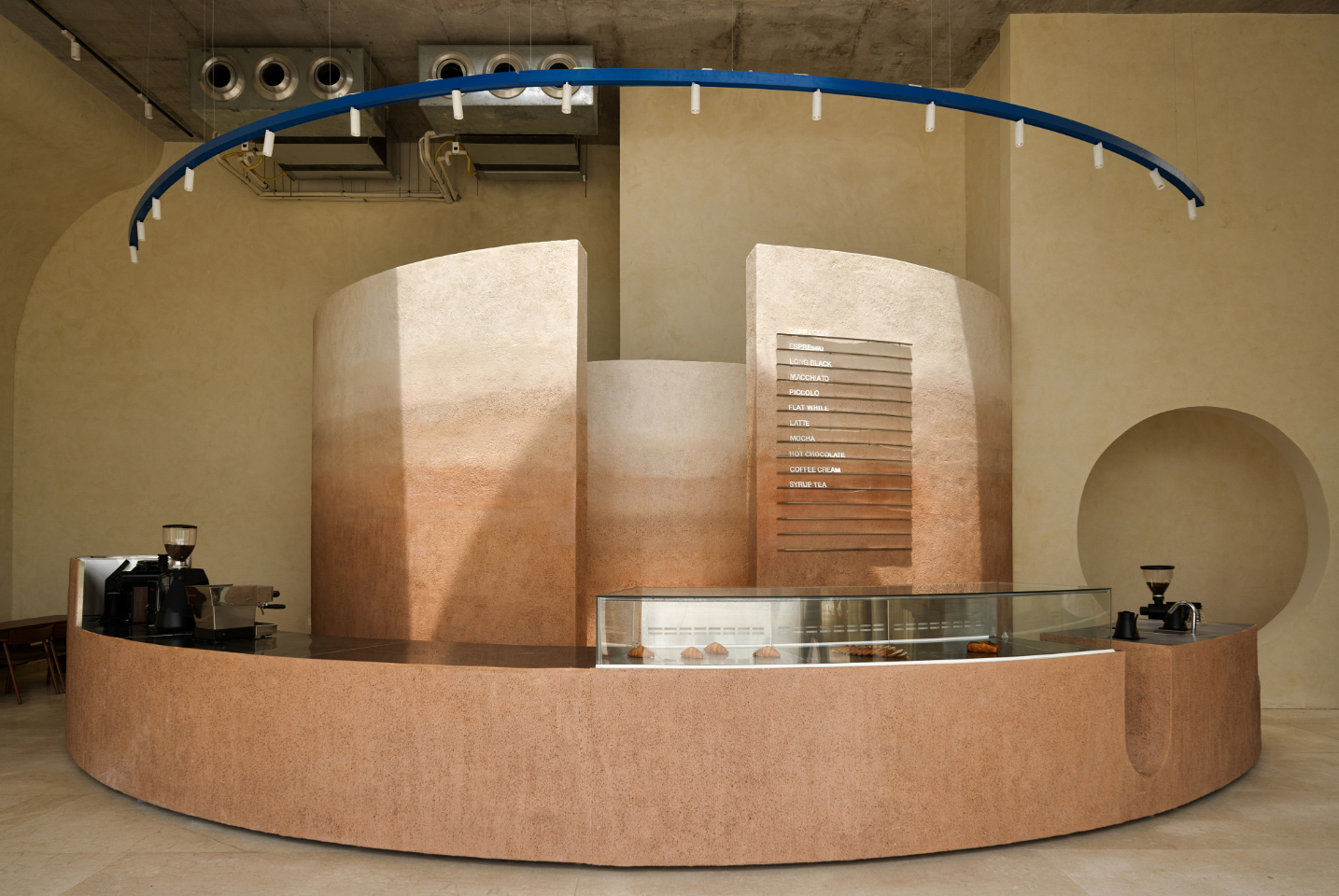 Inspired directly by the Madras beach, the palette and identity of the coffee shop draw from the coast itself. It lends both colour and name to the brand. “The beach already had everything we needed,” the architects explain. “It offered a reference point that was honest and deeply rooted in Chennai.”