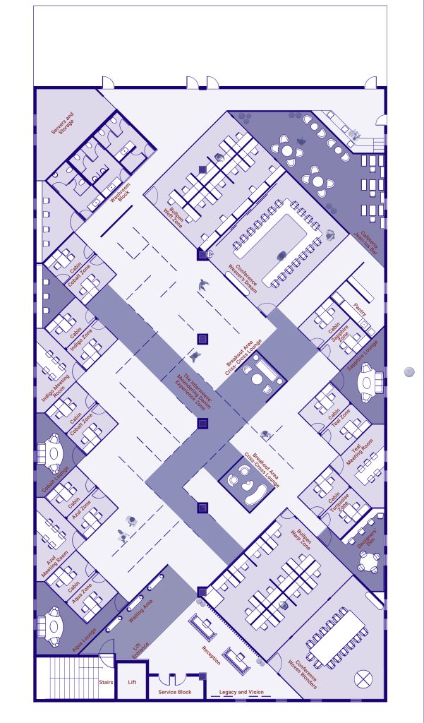 The design interlaces enclosed program—such as offices, meeting rooms, and service areas- along the periphery, oriented at 45 degrees, forming triangular and trapezoidal residual pockets.