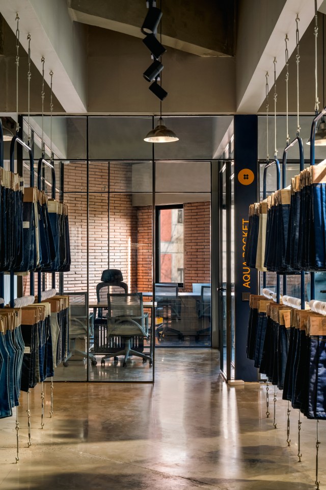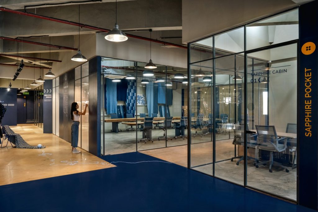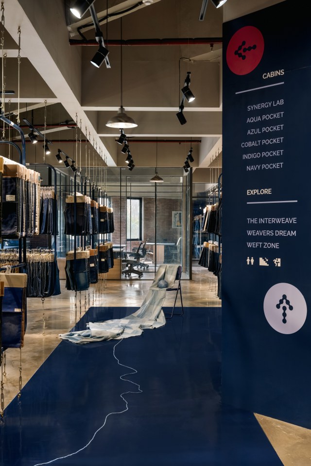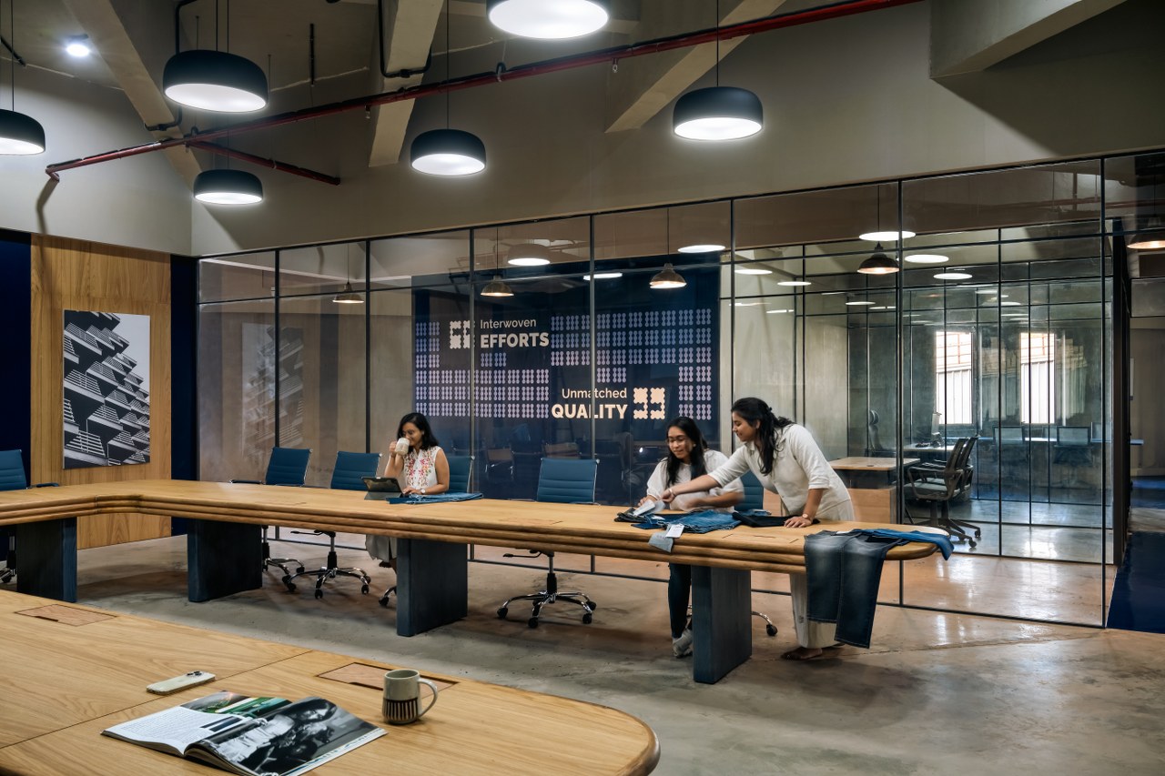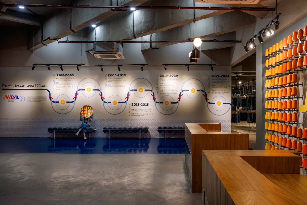The Interweave, located on the third floor of an active textile production facility, serves as a B2B experience center for Jindal Worldwide Limited. They are a leading manufacturer of denim yarns and fabrics. Positioned above working factory units, the 16,200 sq.ft. space allows the brand to engage directly with its global clientele. Thus, offering opportunities for product exploration, brand storytelling, and transactional engagement.