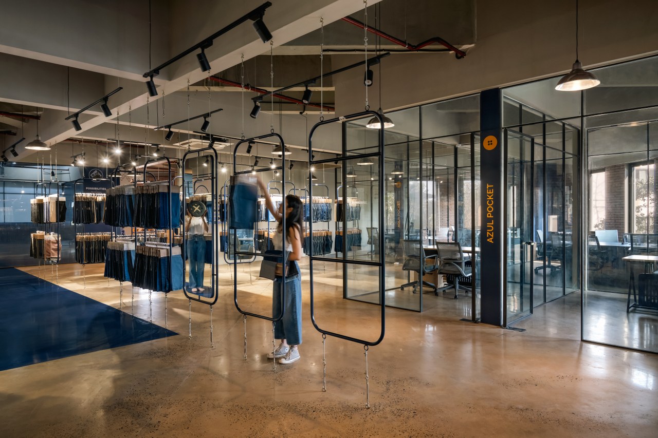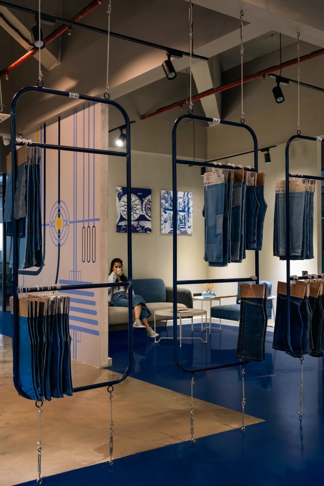 At the core, a meandering display system acts as the spatial and conceptual spine of the experience. Inspired by the field-like expanse of denim production, this central gallery adopts a labyrinthine pathway, punctuated by modular display frames suspended using steel tension cables.