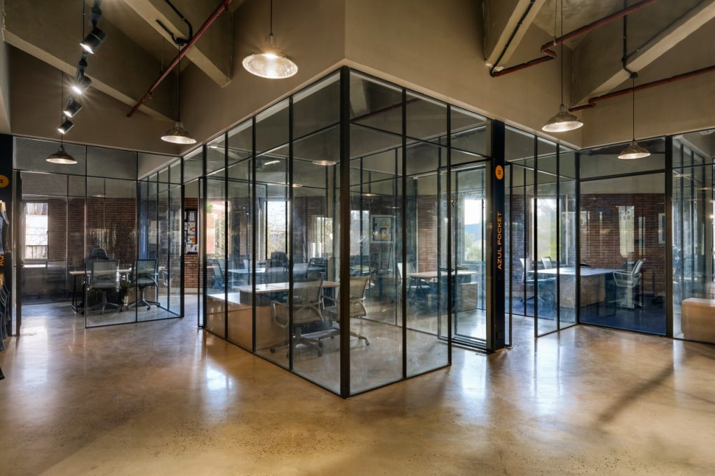 These in-between zones function as informal breakout spaces, and the design strategically positions them to leverage the natural light filtering through the façades, ensuring transparency and permeability.