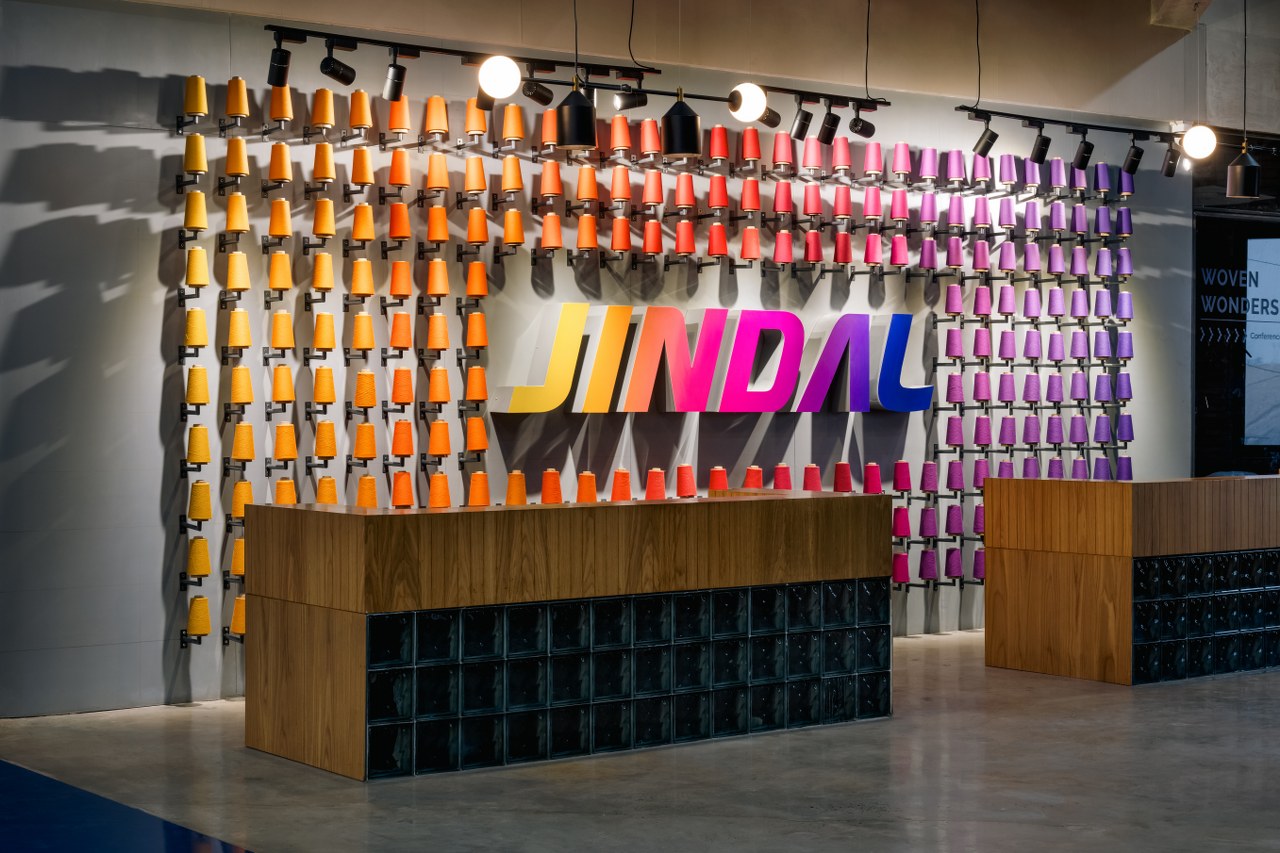 A double reception counter, backed by a feature wall, articulates the entrance sequence. The wall features an installation of thread spools arranged in a chromatic gradient from yellow to blue to violet, abstracting the hues of Jindal’s brand identity into material form. This acts as a transitional threshold from the operational to the experiential.