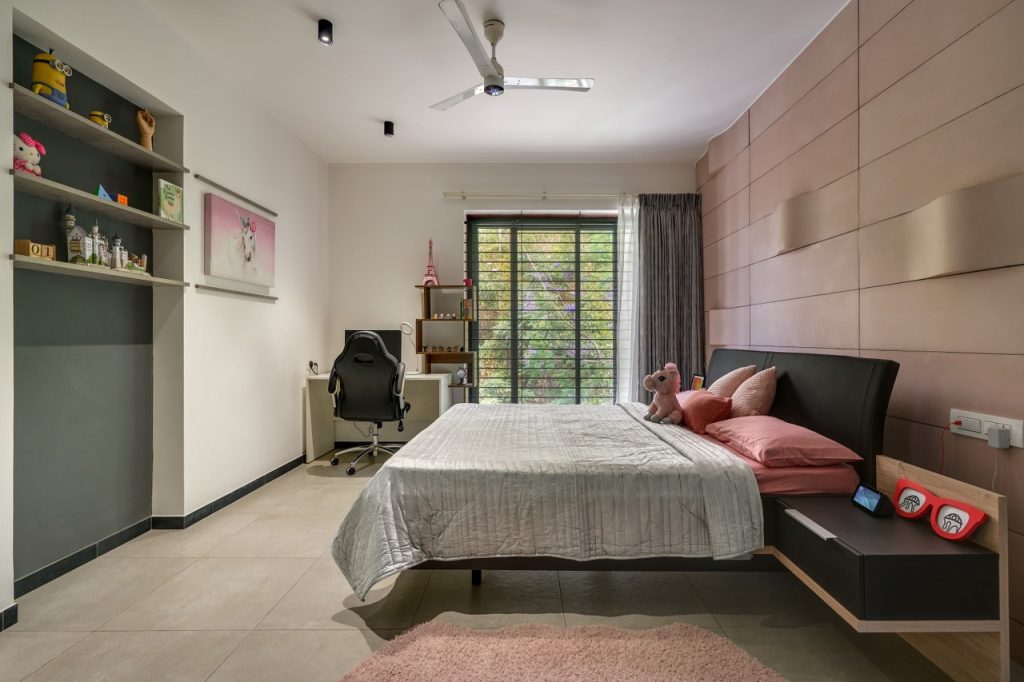 The first floor is dedicated to the master bedroom which is more of a suite room comprising of the bed area, wardrobe area, seating, a small green space and a bathroom while there is also the daughter’s room and a small family space.