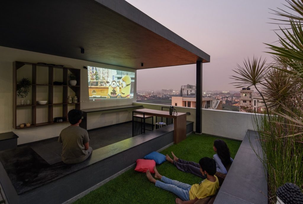 Going up further, a gym & an open landscaped terrace with a barbecue counter completes the house. As a very close-knit family, they regularly host get-togethers and movie nights with their cousins. With the barbecue space also doubling up as a screen and seating, its an ideal gathering space for the evenings.