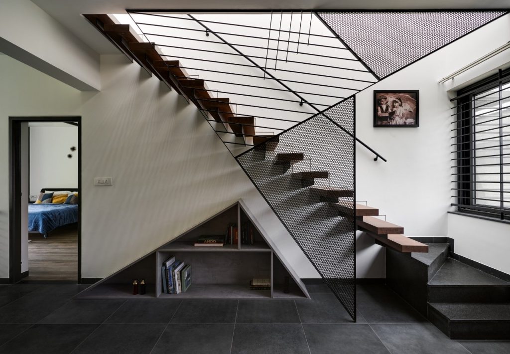 The large quantum of light coming into the house allowed us to experiment with dark & copper shades of flooring. A combination of steel and concrete cantilevers the open staircase from the wall, and a 5 mm tile wrap gives the tread the feel of being made from a solid block. The staircase topped with a skylight makes for shadow patterns which move though-out the day along with the sun.