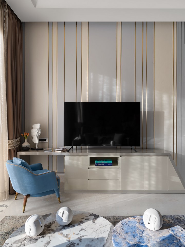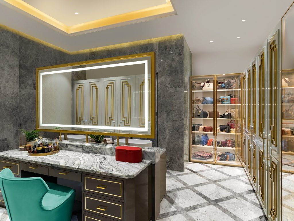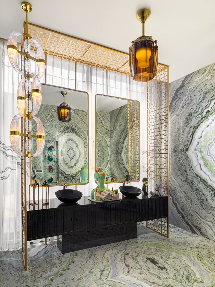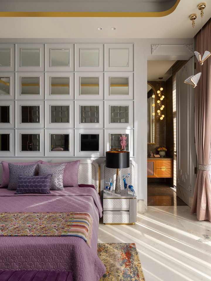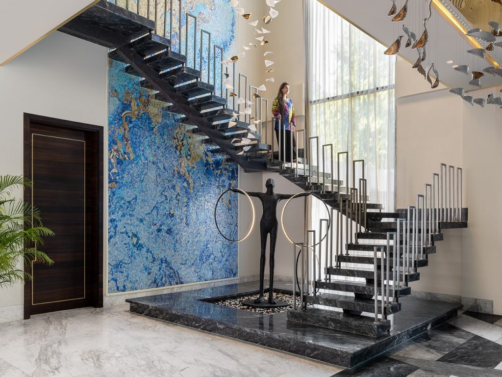 The staircase, flanked by a mosaic wall, leads to serene upper rooms. The master suite, in beige and powder blue, glows with natural light and includes a bath and dressing area where suspended mirrors and brushed gold finishes blur the line between design and dream.