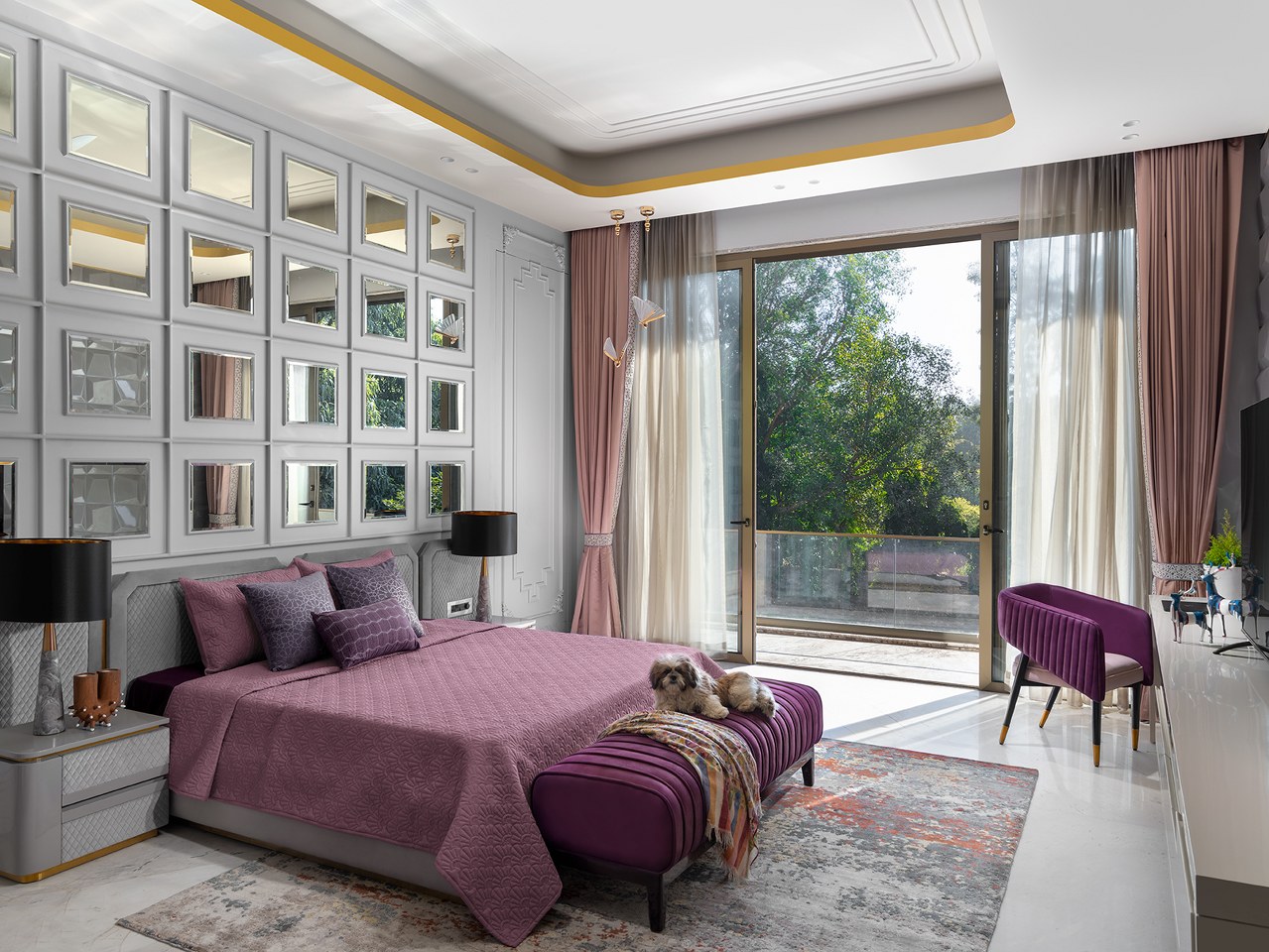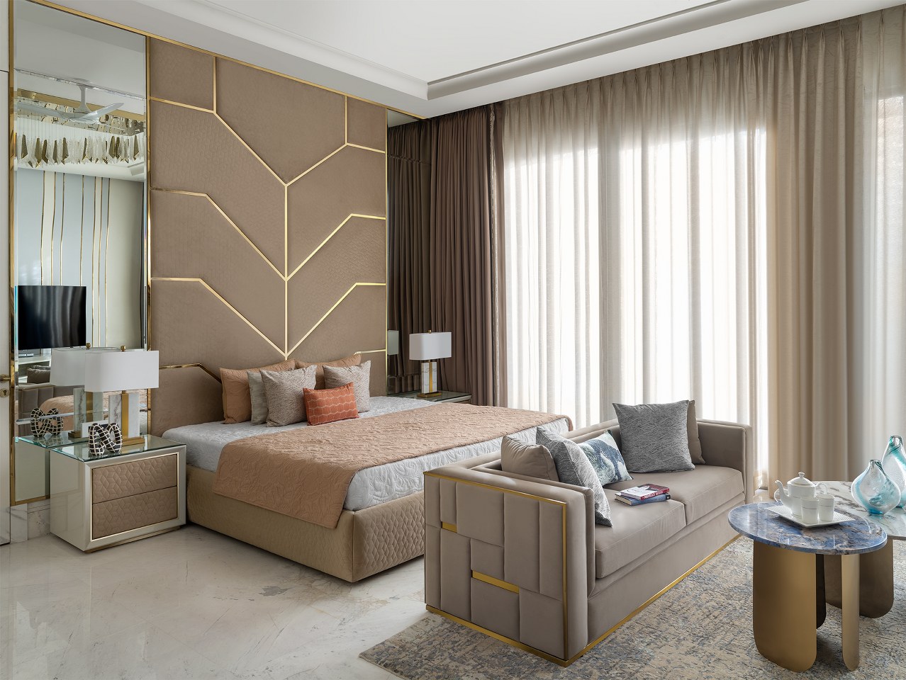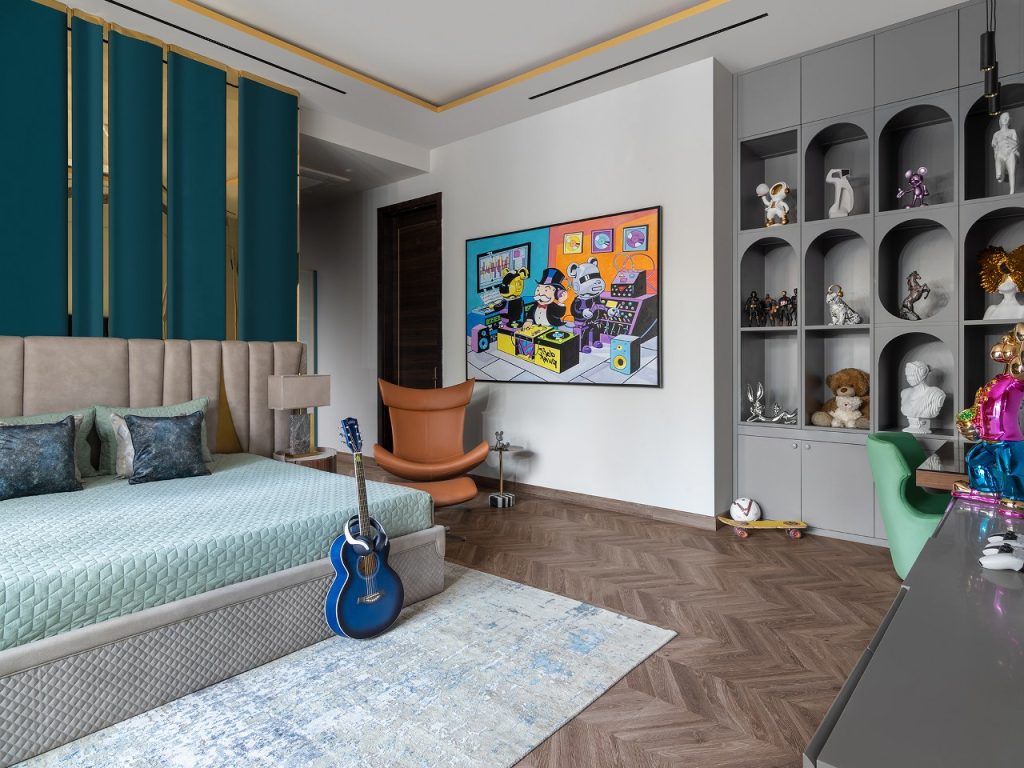 The staircase, flanked by a mosaic wall, leads to serene upper rooms. The master suite, in beige and powder blue, glows with natural light and includes a bath and dressing area where suspended mirrors and brushed gold finishes blur the line between design and dream.