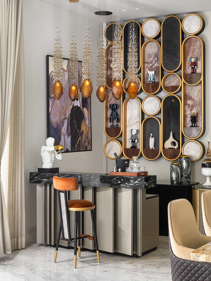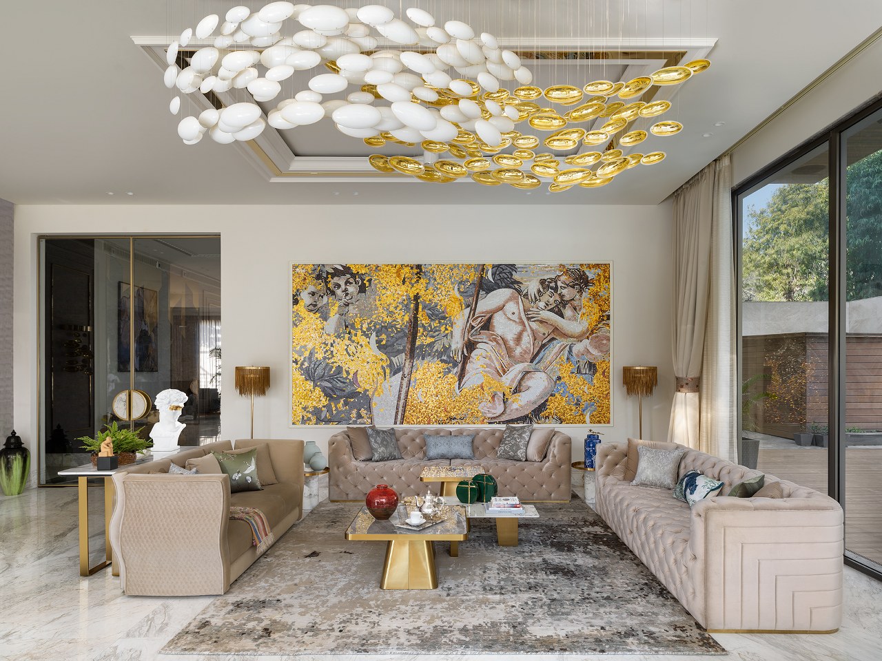 Neutral tones are elevated with gold accents, plush furniture, and bespoke pieces—a Hermes artwork here, a veined marble dining table there.