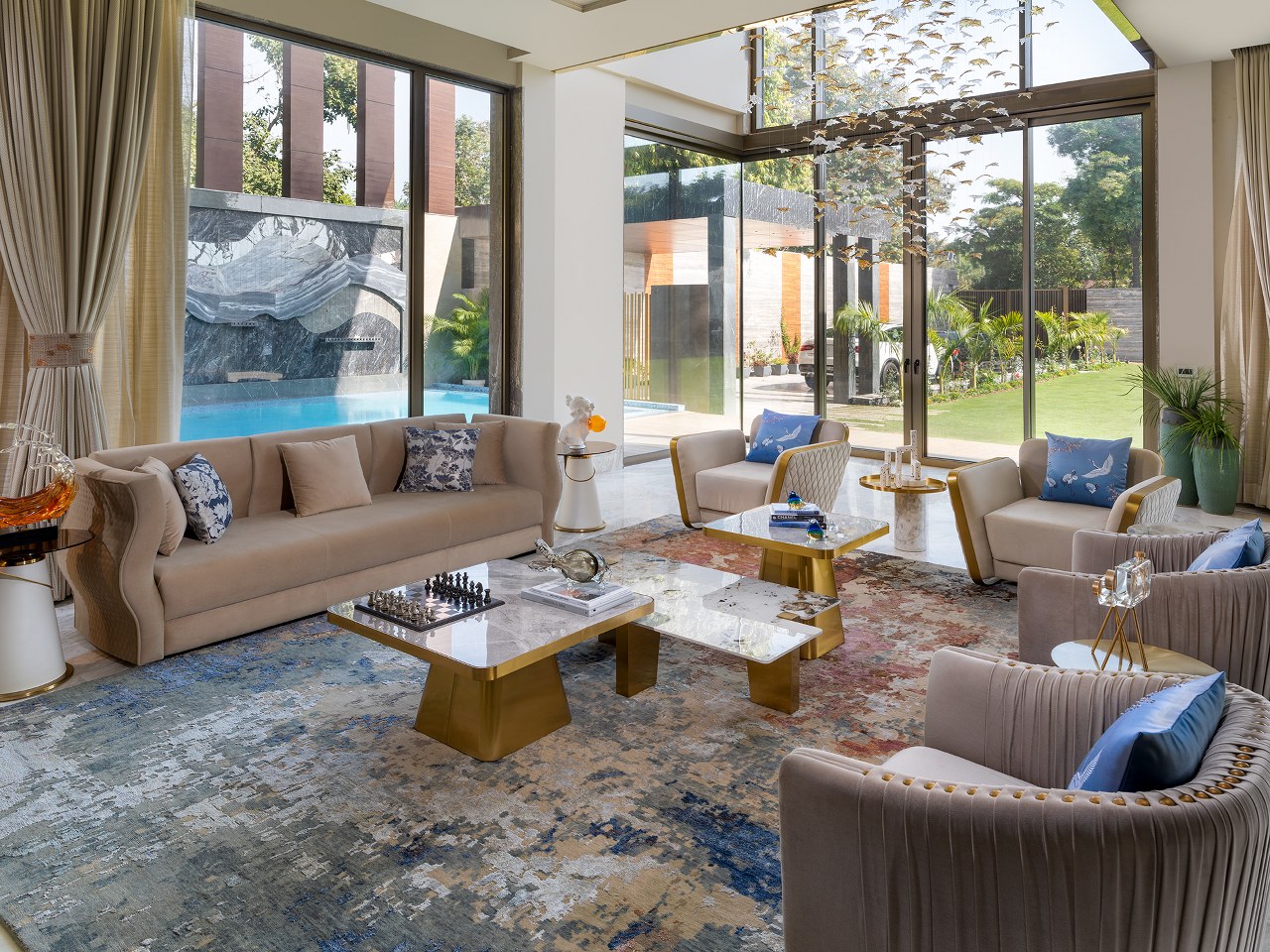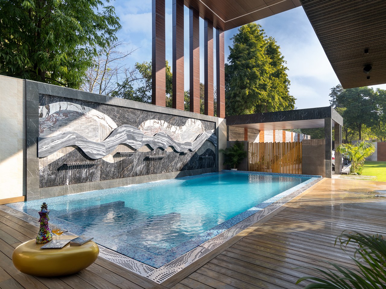 The five-bedroom home blends architectural dramatical living experience with emotional warmth. A 24-foot-tall porch and MS-framed wooden doors set the tone for what lies within—panoramic windows, expansive lawns, and a shimmering pool framed by a marble wall that mimics the flow of a gentle stream.