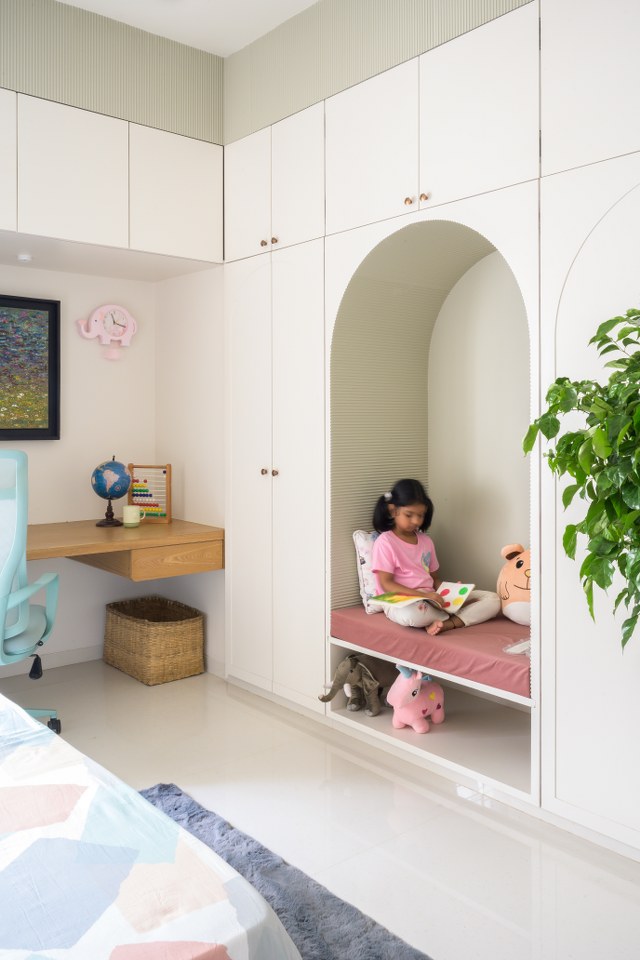 “In the young daughter’s bedroom, the designers transformed part of the closet into a small, cozy reading nook—a space where imagination can thrive and the child can unwind and explore in comfort.”