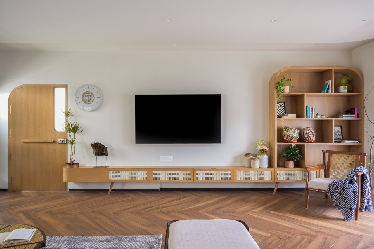The TV console features cane, that blends with the room’s color palette, unified by a cohesive design language.