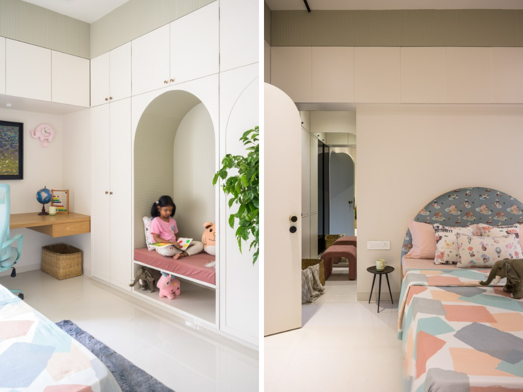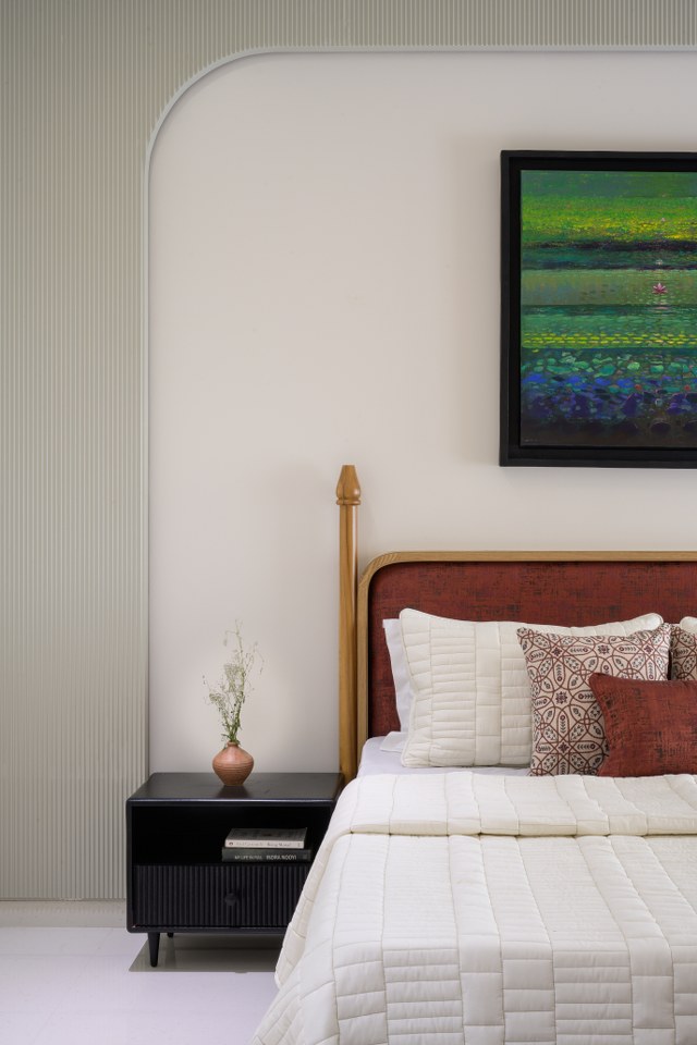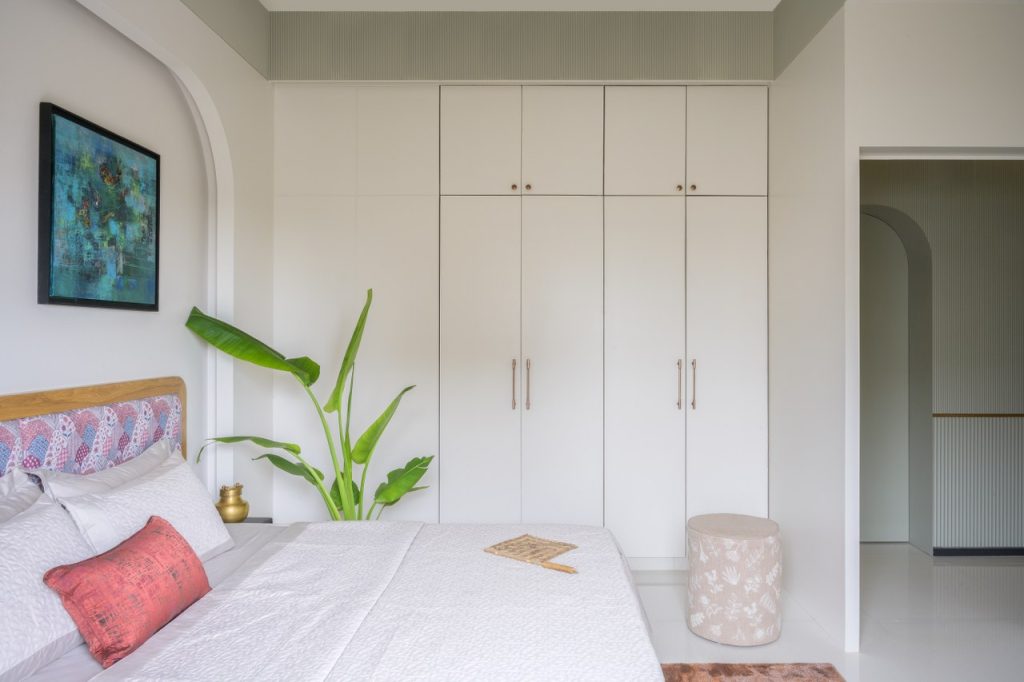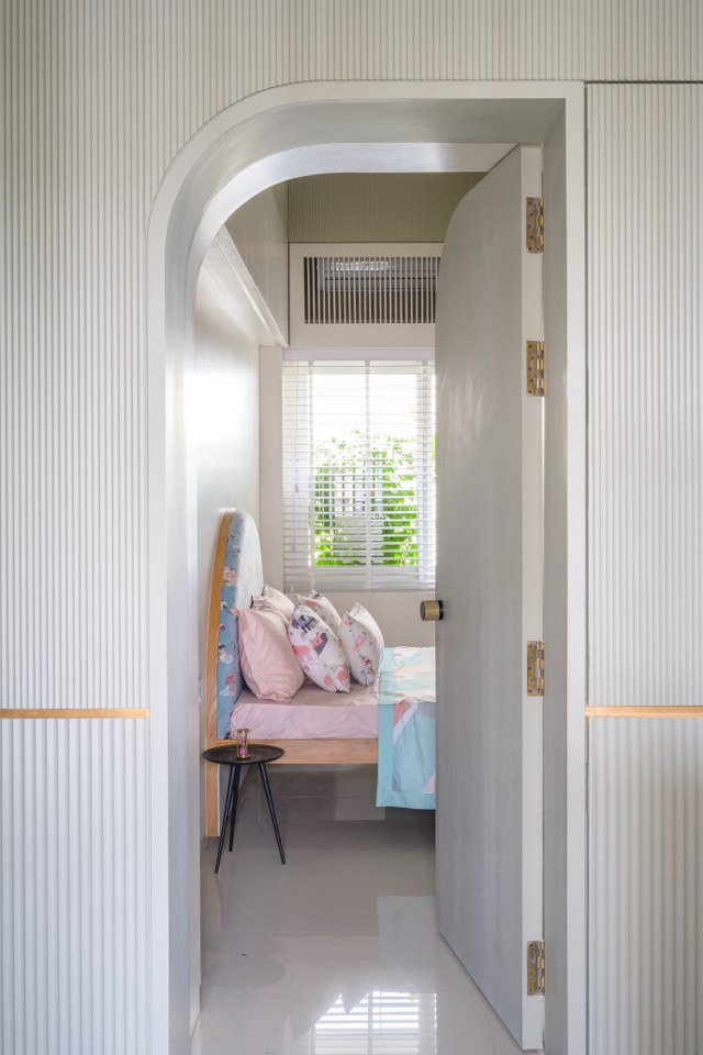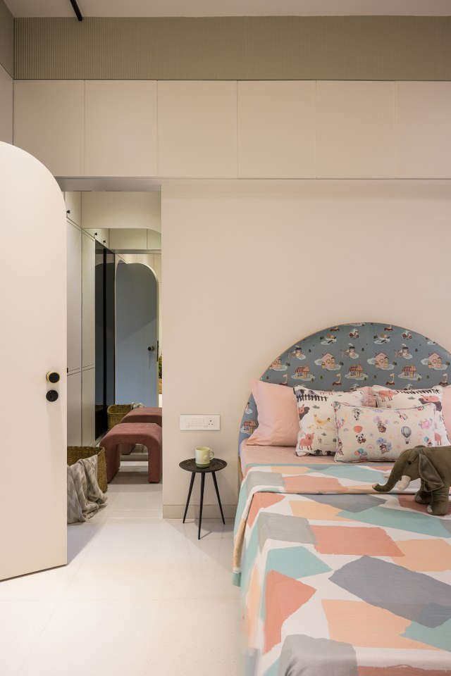 “The designers used subtle and minimal design elements to create a calm and comfortable atmosphere in the parents’ room. They highlighted the bed’s backdrop with graceful arch paneling, adding a refined touch to the space.”