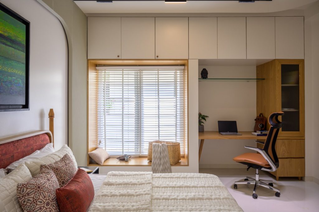 The master bed includes a study unit, with a seating window beside it that maximizes the compact space. The windows flood the room with natural light, enhancing its sense of openness and connection to the outdoors.