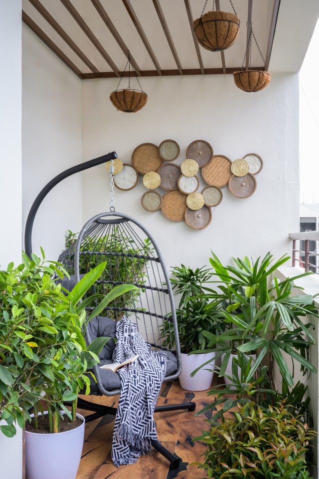 The living with its green space enjoys abundant light, with lush potted greens bringing in a refreshing energy to the palette.