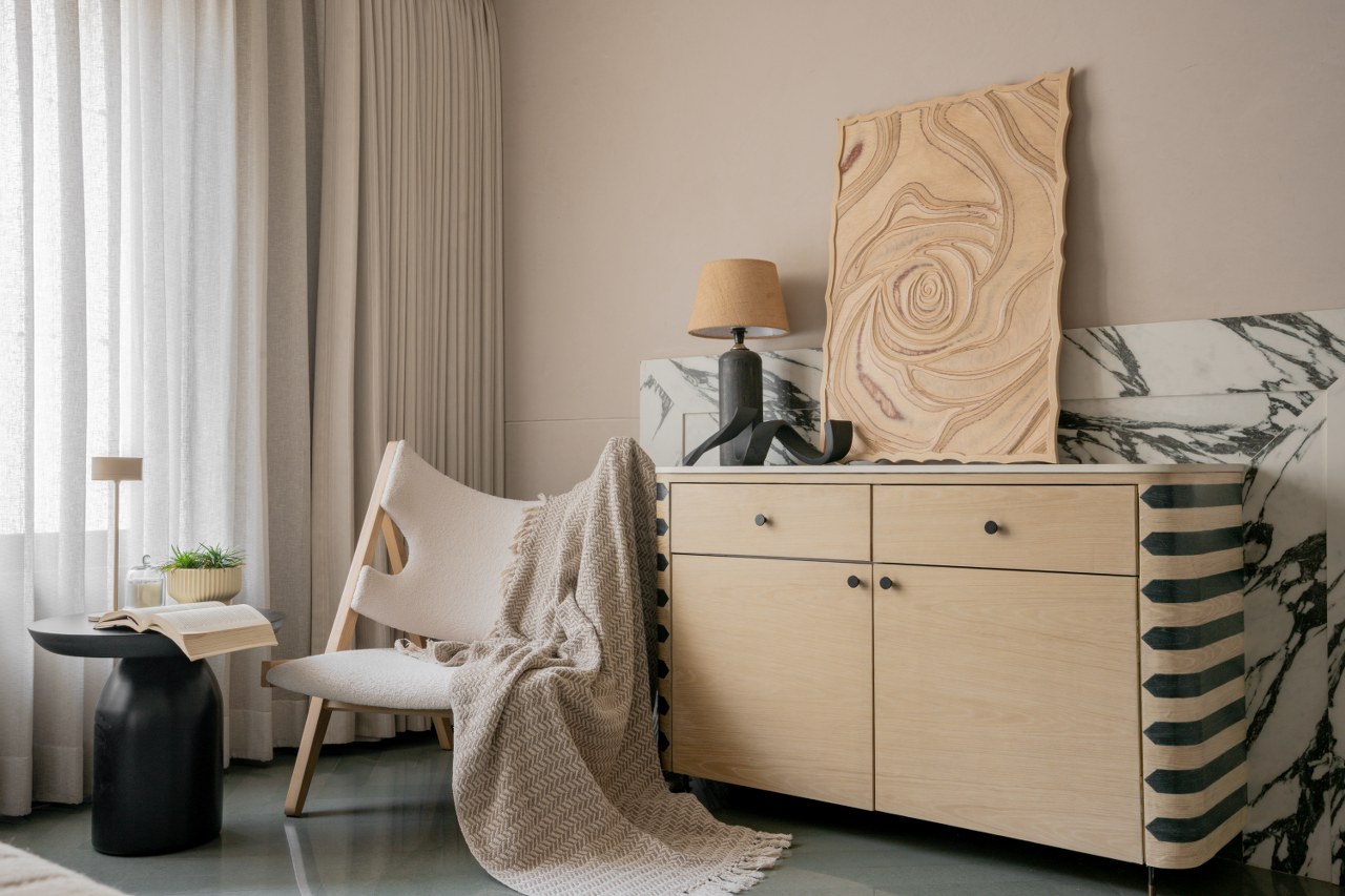 The home is envisioned as an expression of Indian modern living, where rooted traditions meet contemporary clarity. The design embraces Kotha stone in its raw honesty, weaving in textures that celebrate craft and tactility. Ash wood stained finishes bring warmth, balancing the solidity of stone with a softer materiality. Each surface reflects refined restraint, shaping a timeless, contextual home.