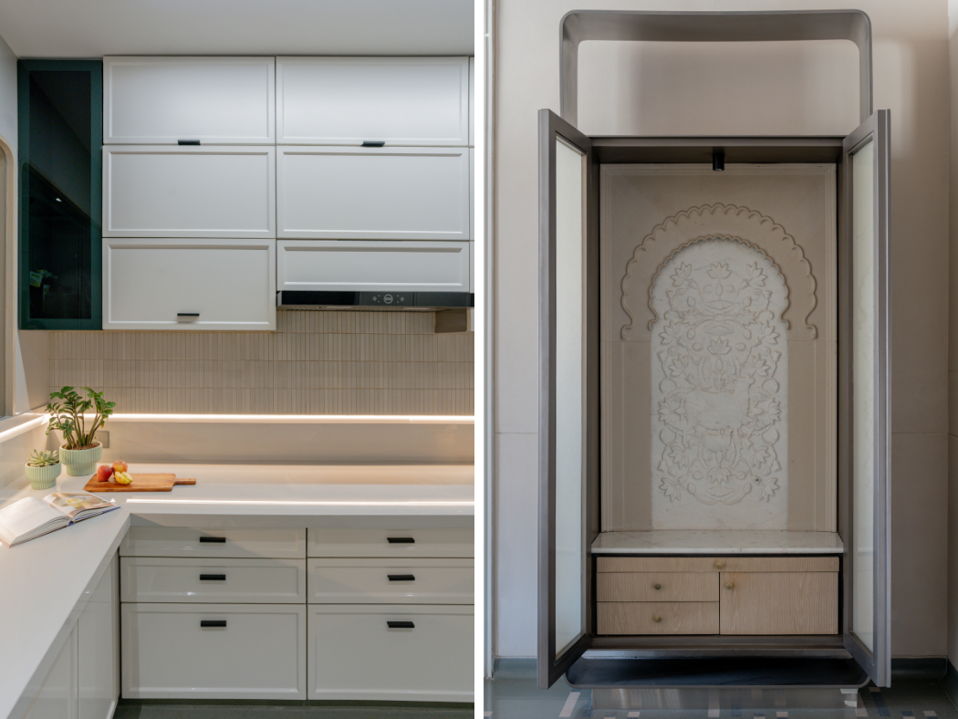 The designers reimagined the layout to enhance both functionality and comfort. The entry opens into the home’s heart, with the living room to the right and the mandir, kitchen, and light-filled chokdi to the left.
