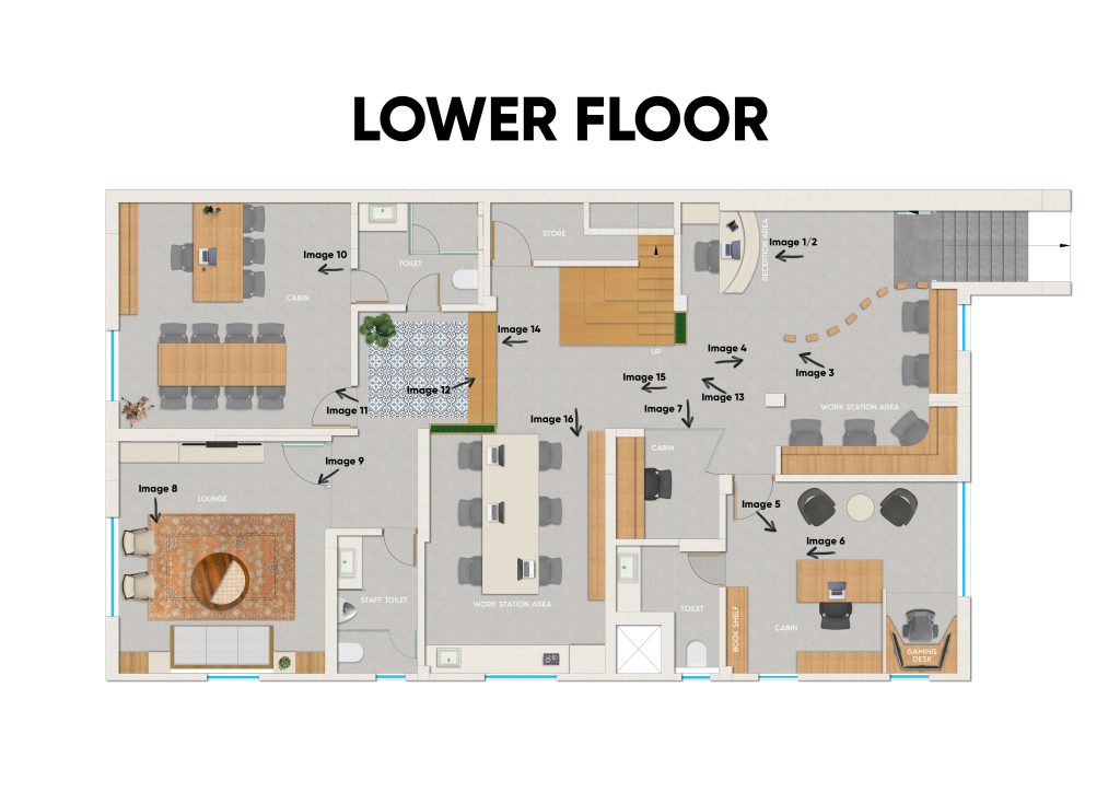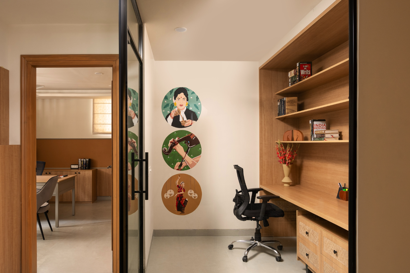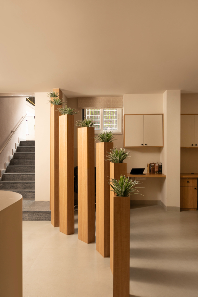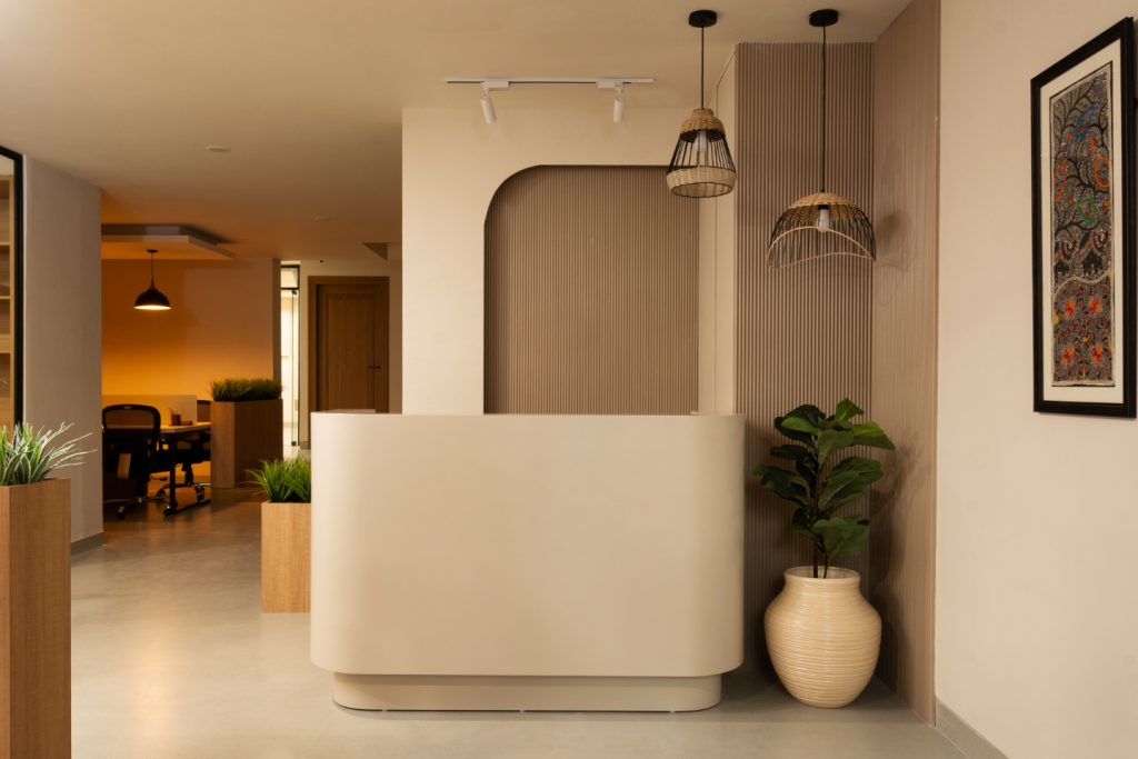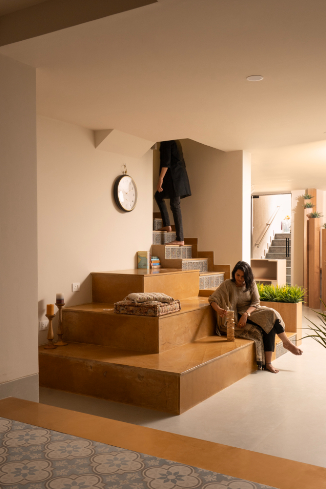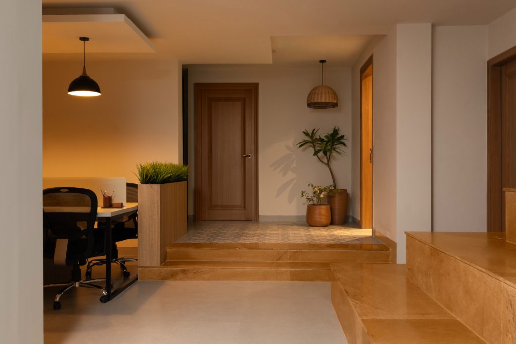 The office floor is accessed via a welcoming reception area with distinctive Jaisalmer steps, setting the tone for a sophisticated yet practical environment.