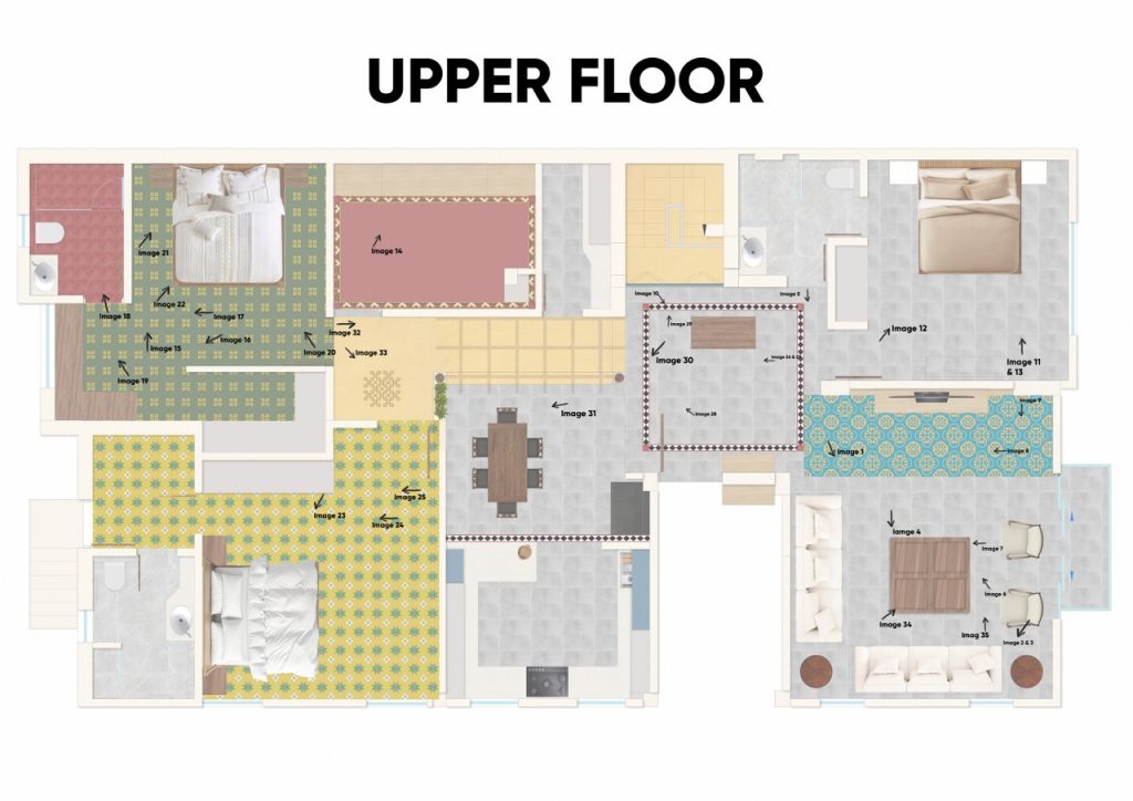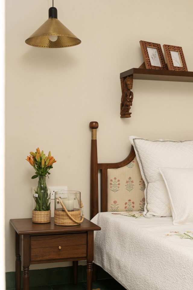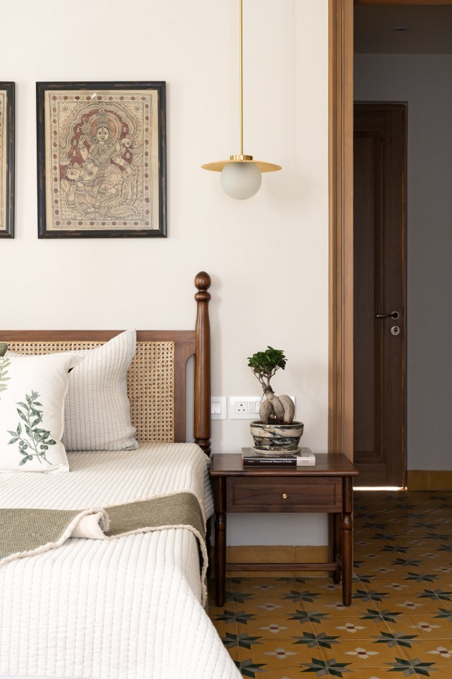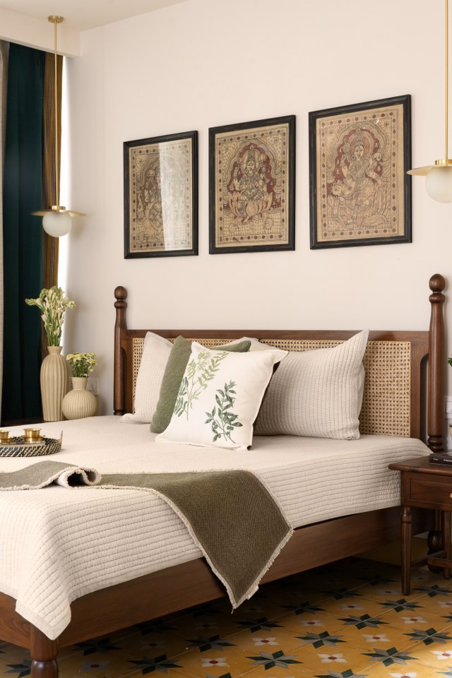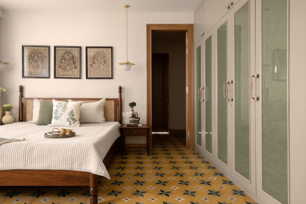 Private spaces prioritize comfort, with the parents’ room featuring a yellow-green floor and hand-painted Kalamkari wardrobes and saree curtains.